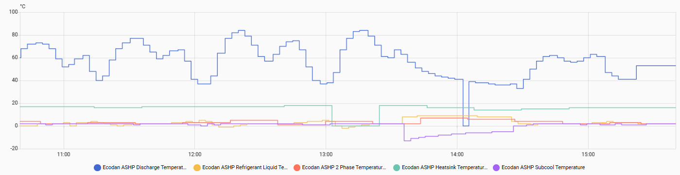 Everything looks very stable apart from the discharge temperature that seems to drop after the input to the compressor has been reduced before the control algorithm appears to freak out and up the compressor again.