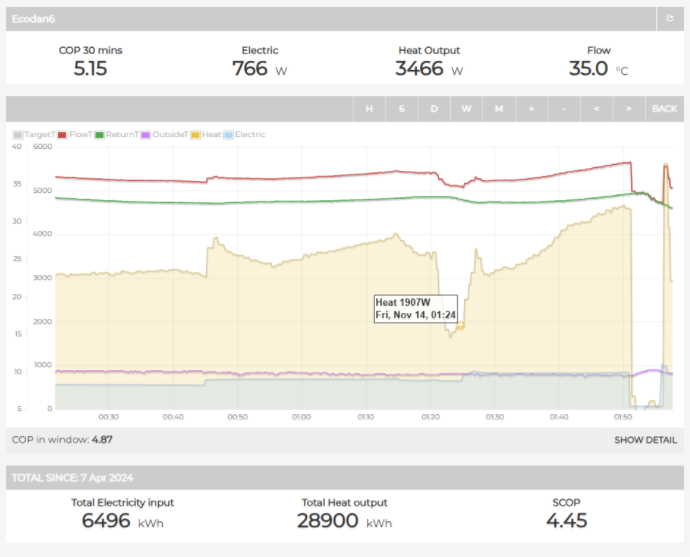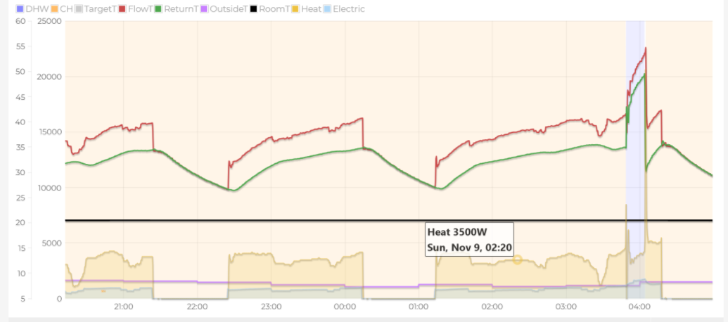 I was looking for steady state on yours. Yours is possibly better than my 6kW. I see it almost achieves steady 3.5kW. But how come it does that here with a steadily rising flow,return temps? is it overshooting the target flow temp?