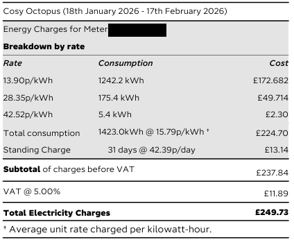 We have battery storage which generally covers the heatpump usage. 95% of our grid usage is therefore in the off-peak period so electricity cost will be dropping by about 25% with the new rates.