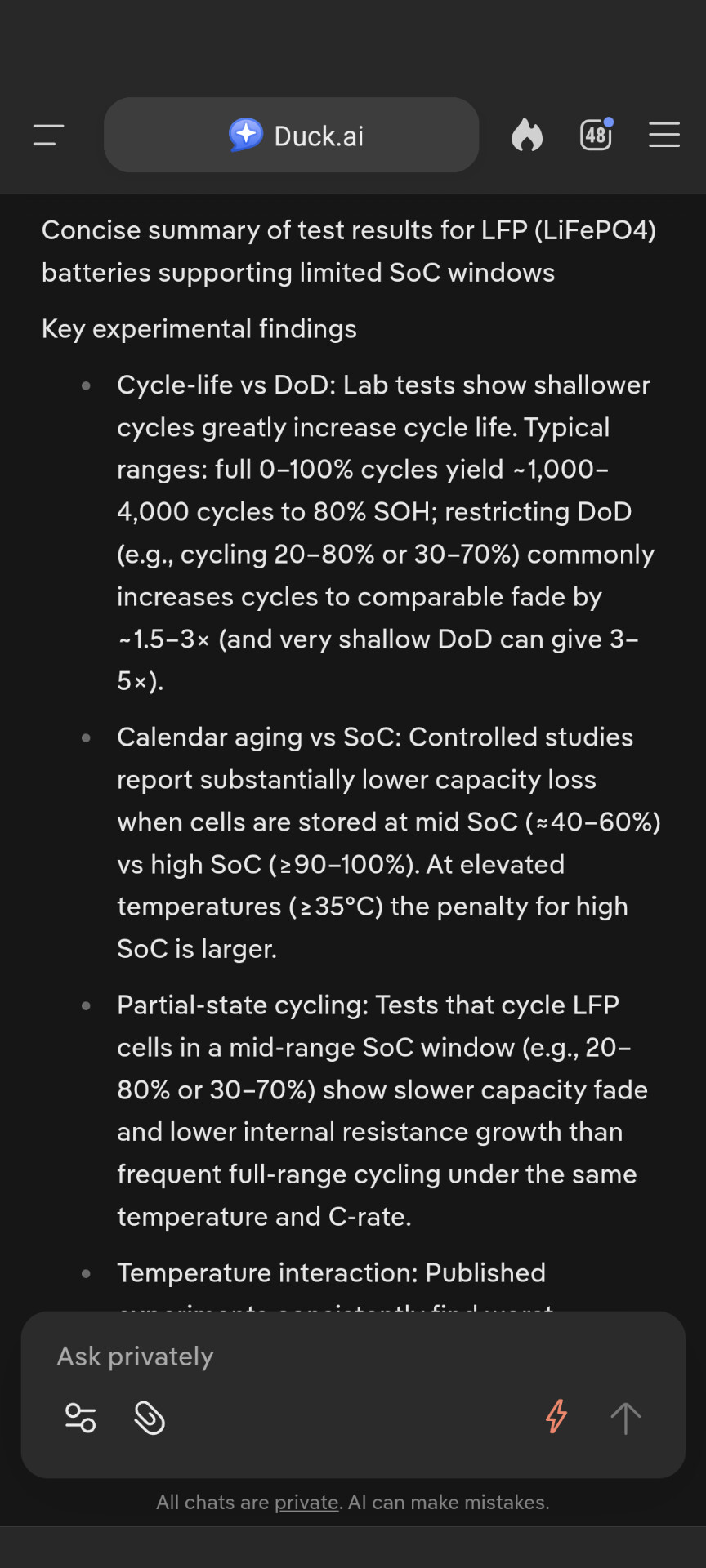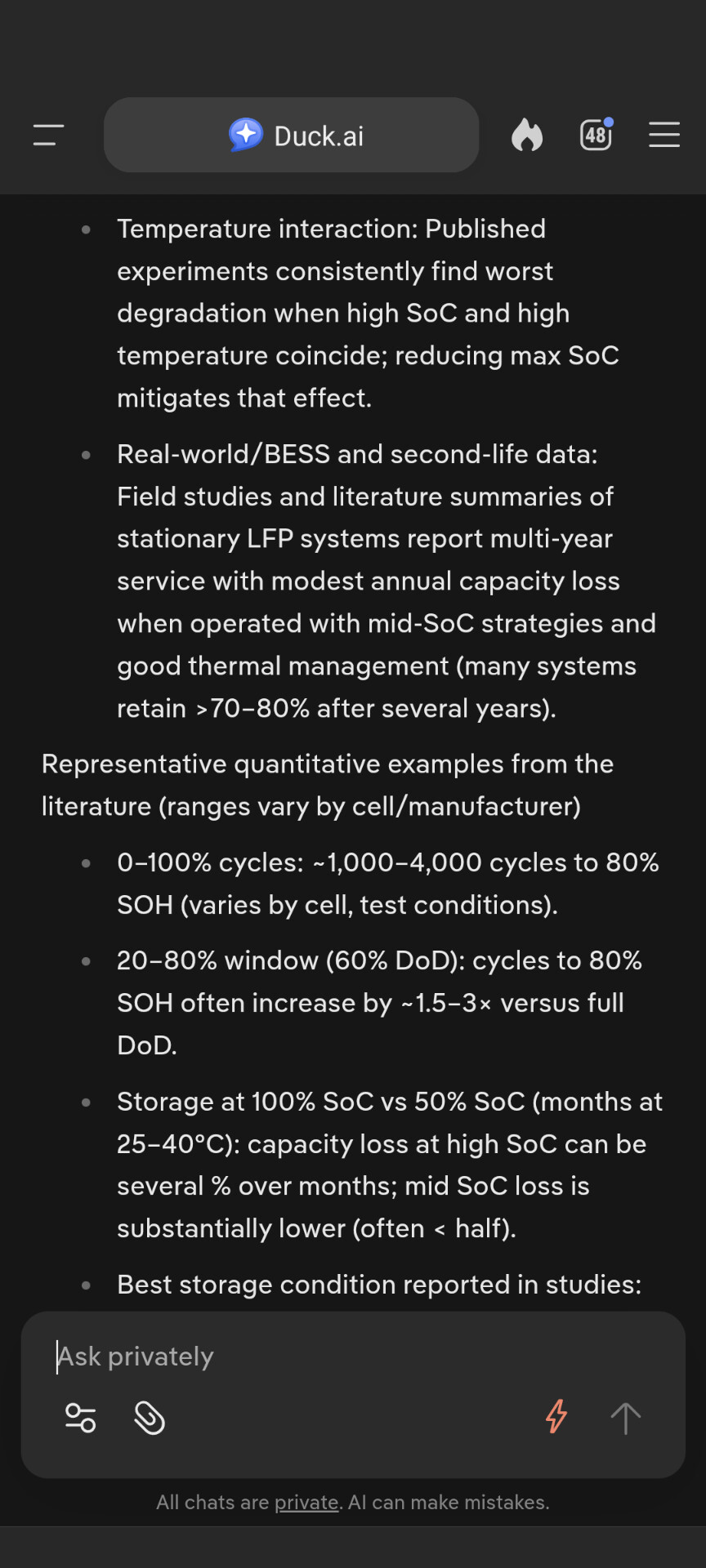 Hi Martin, I am bit confused. I thought that the 20% to 80% cycle test data was for Li-ion. Can anyone find a reference that LFP home storage can be cycled from 5% to 100% without too much degradation other than aging? Certainly that is what is claimed in the link above but maybe they are wrong. Lots of conflicting information out there.