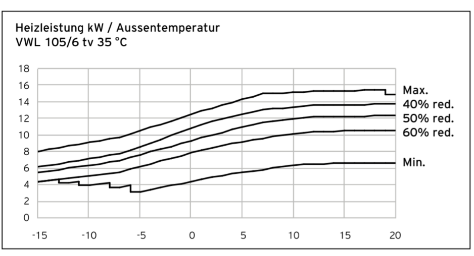 At 35°C design temperature and -2°C outdoor temperature, the Vaillant is rated for around 11 kW but can modulate down to around 4 kW so you’re comfortably in the operating range even taking defrosts into account.