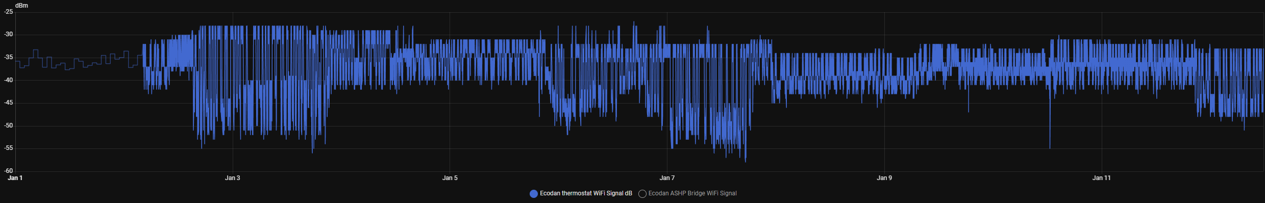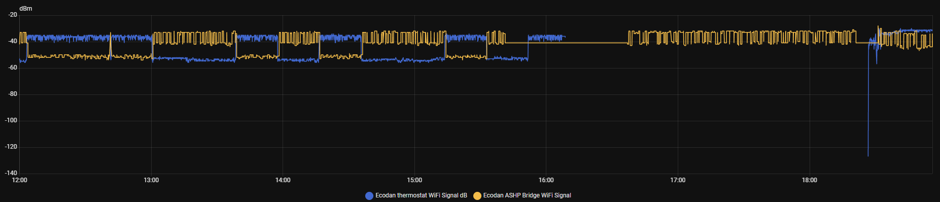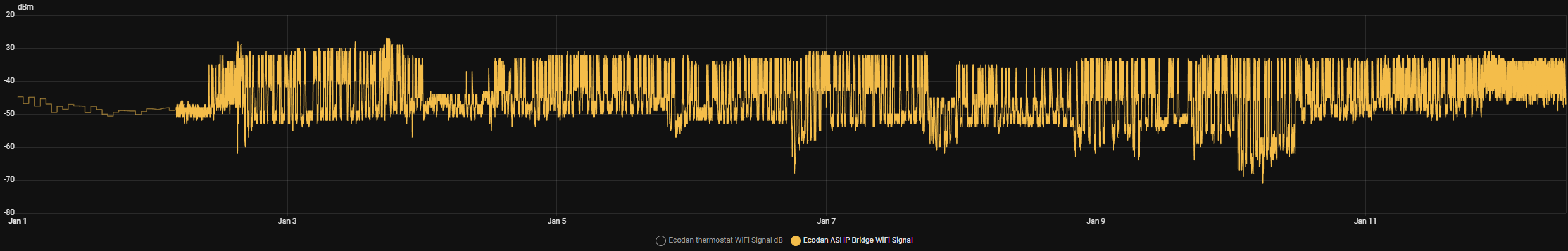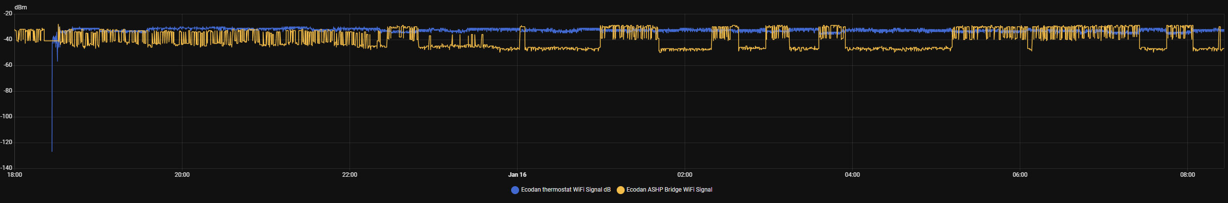 Finally changed on 17th around 21-22 the CN105 esp32-s3 dev to atom m5 and switched off my nrf24 devices. On 18th around 10 Iâve turned back on NRF24 devices and slight interference started. Both atoms are on top of HP. Canât find the reason for this occasional higher/lower signal fluxuations over night. Signals wonât match with compressor and canât think of anything else disturbing it. But for now itâs a lot better than it was at first.