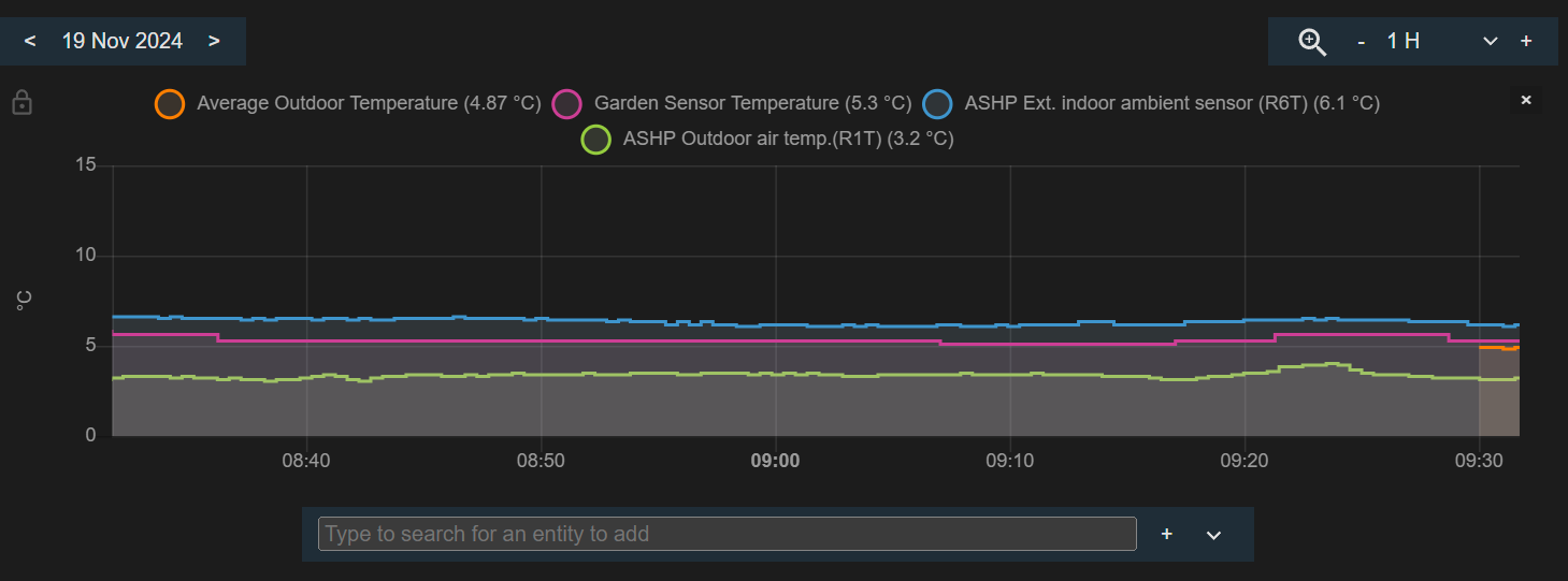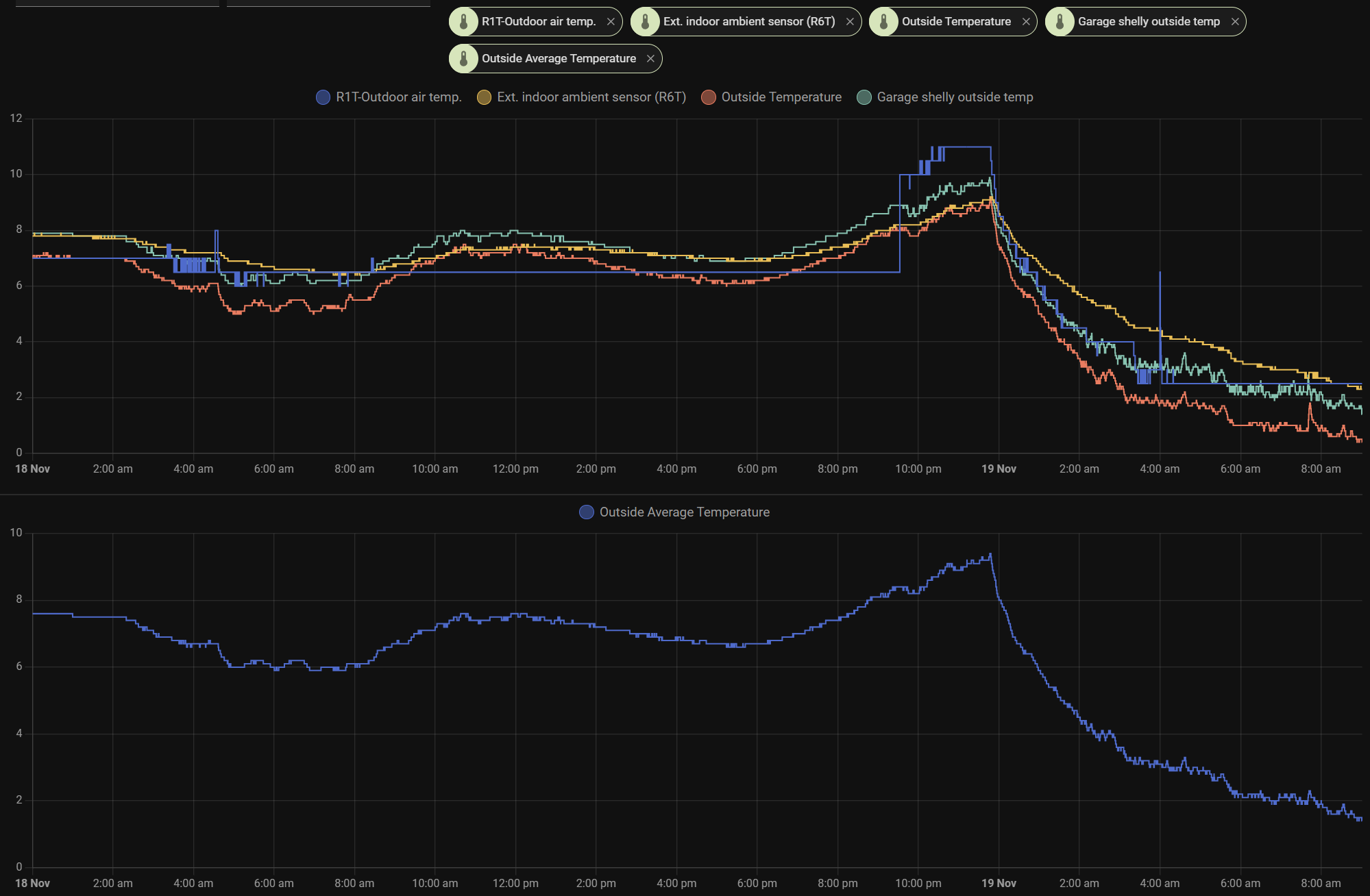 My outdoor temperature always dips when the heat pump is on. You can see it (purple) rising when the heat pump is off. Not very reliable ![]()