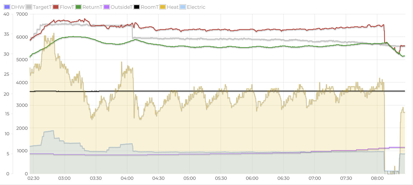 So you do get stable flow temps at 35c which i hadn’t spotted before. I had meant that the ripples are in the return here. The puzzle is that with a stable flow temp you should be seeing a much better cop in these conditions. As the rads here are coping with the output I’m wondering if the lower than expected cop and maybe the ripples are due to how and where you are measuring the flow and return temps? I’ll send a sample from my unit under similar conditions to show how I suspect your unit is really performing..either there is a fault in your unit or in your measurement.