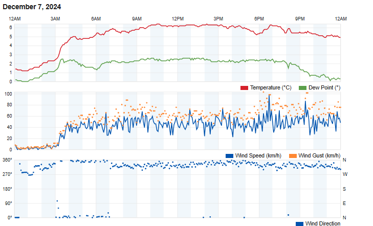 15:19 Air Temperature 6.2C, RH 76%, wind speed 73km/h