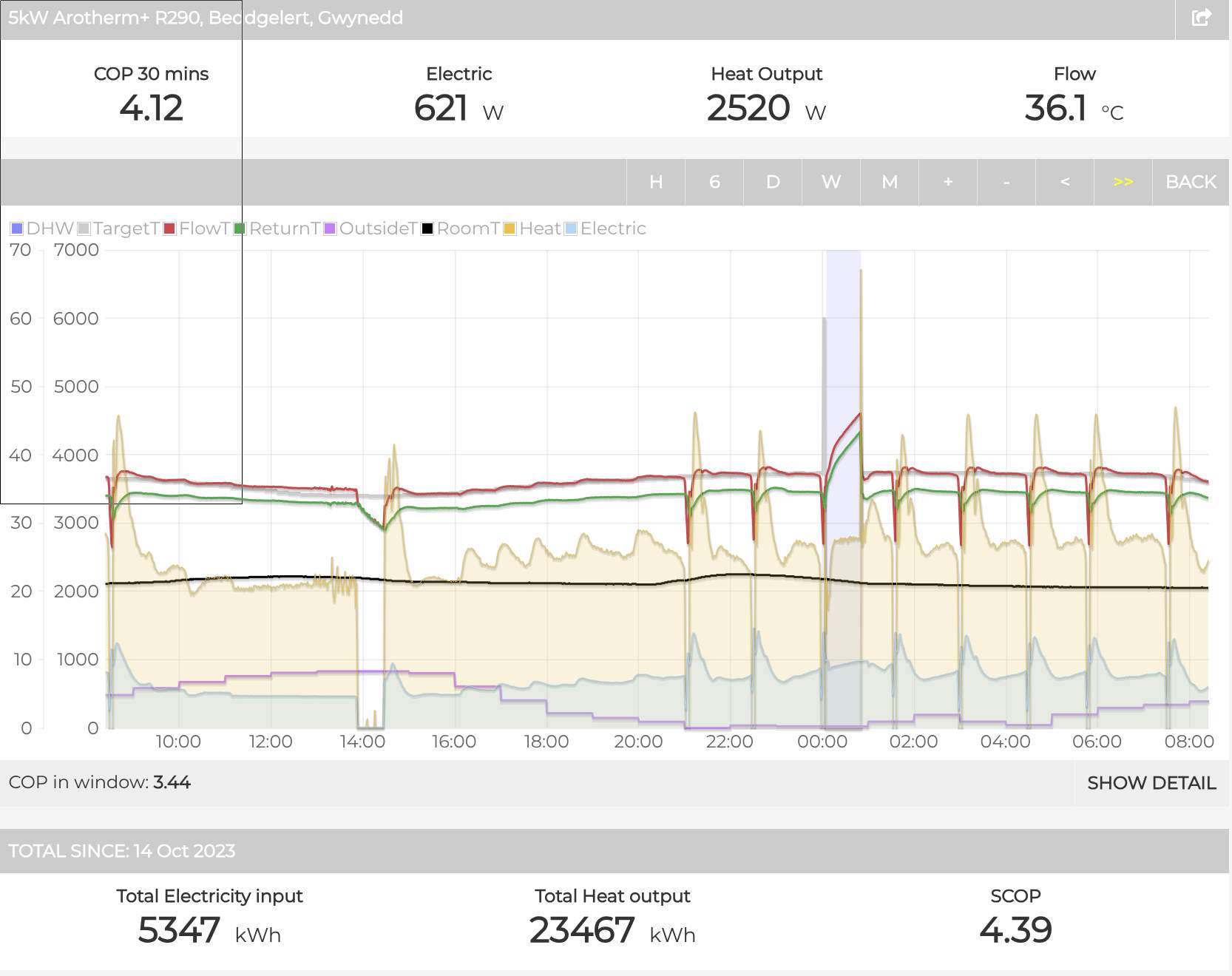 Example of Glyn Hudson’s install in Beddgelert attached. I am presuming the sudden dips in power every 90 mins or so are defrost cycles. Eg before 21:00 on attached image - no defost, but defrosting every 1.5 hours or so after when outside temperature drops to 0C.