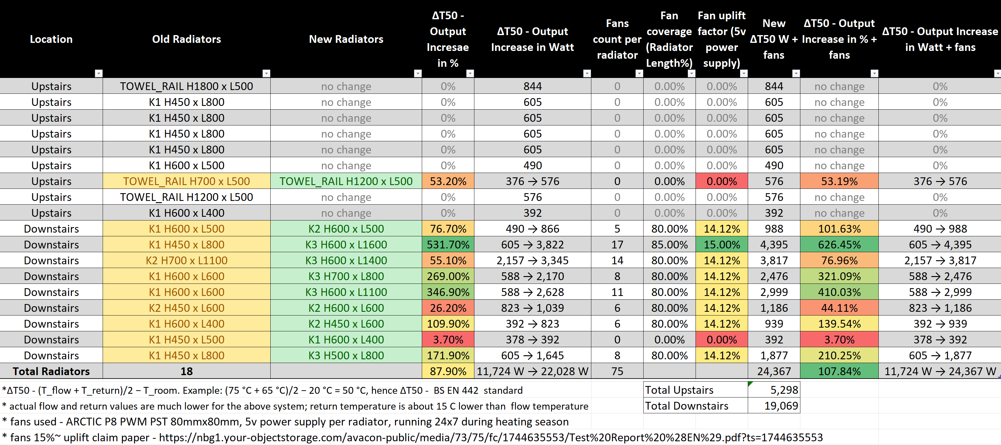 Here’s my radiator upgrade with the estimated heat output using the standard dT50 approach