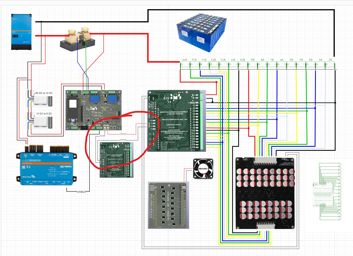 Hi, i want to use the modules V4.20 (orderd for my LiIon Powerwall 2020) with my new LFP 16s Pack. I also have a current meter an a controllerboard with display. I have connected the dyiBMS Controller with a Victron Cerbo GX. After connect the Cerbo to the inverters, the inverters go into error state ālow batteryā. My oppinion is, that the BMS decide to disallow charging and discharging. And also I can see, that diyBMS sends a temperature of 0°C to the Cerbo. At the modules are no external temperature sensors installed.