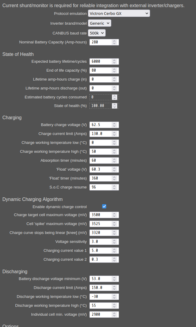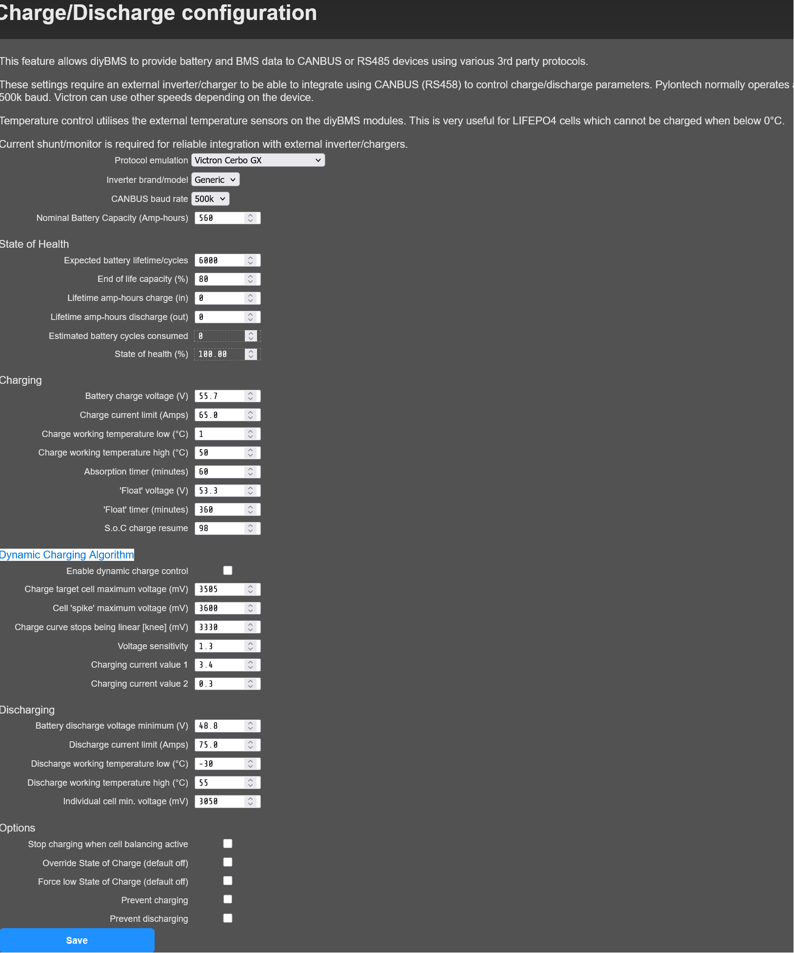 PS: I also noticed that Iād left a comment against Victron and the 351 message - if Victron doesnāt receive this message at least every 3 seconds Victron will stop charging automatically - its a failsafe to ensure if the BMS dies, the battery stops charging. DIYBMS should be sending this message approx. every second.