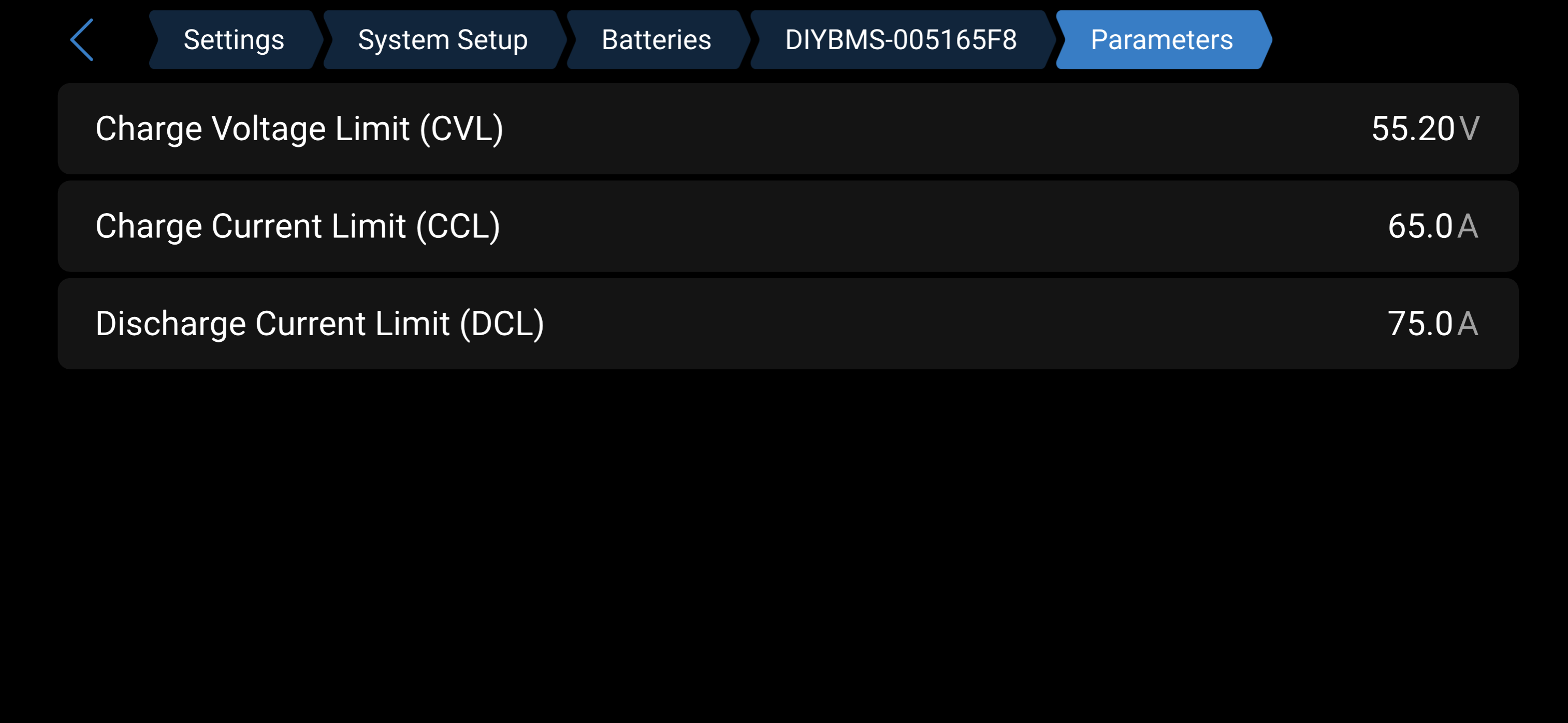 In the Victron VRM portal, you can also view the CVL and CCL values under āAdvancedā. You could take a screenshot there.