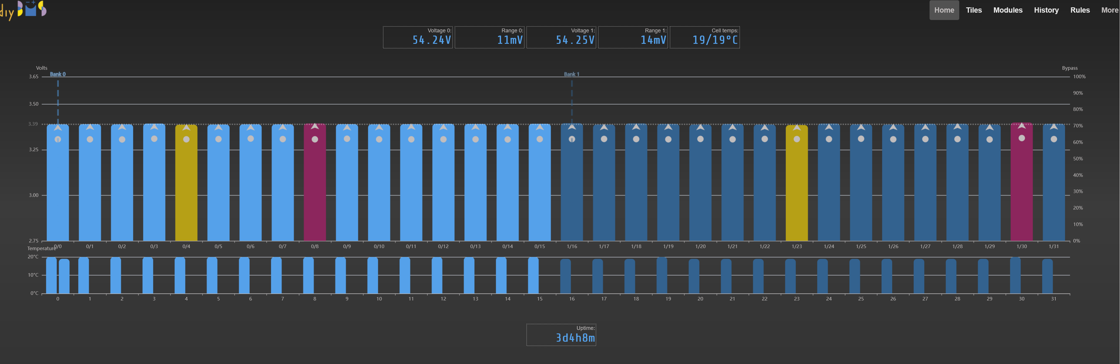 Iām looking at using diyBMS with an 18S LiFePO4 setup, itās 4P totalling to about 840Ah off the top of my head. Itās going onto a Victron setup with a Multiplus 10000VA inverter, smart solar MPPT and Cerbo GX.