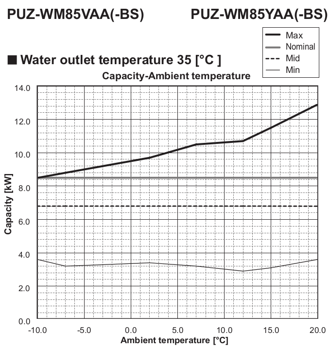 This shows the minimum to be around 3.5 kW, but it can reach or exceed 8.5 kW at all temperatures. For comparison, your current unit can do between 4 and 12 kW.
