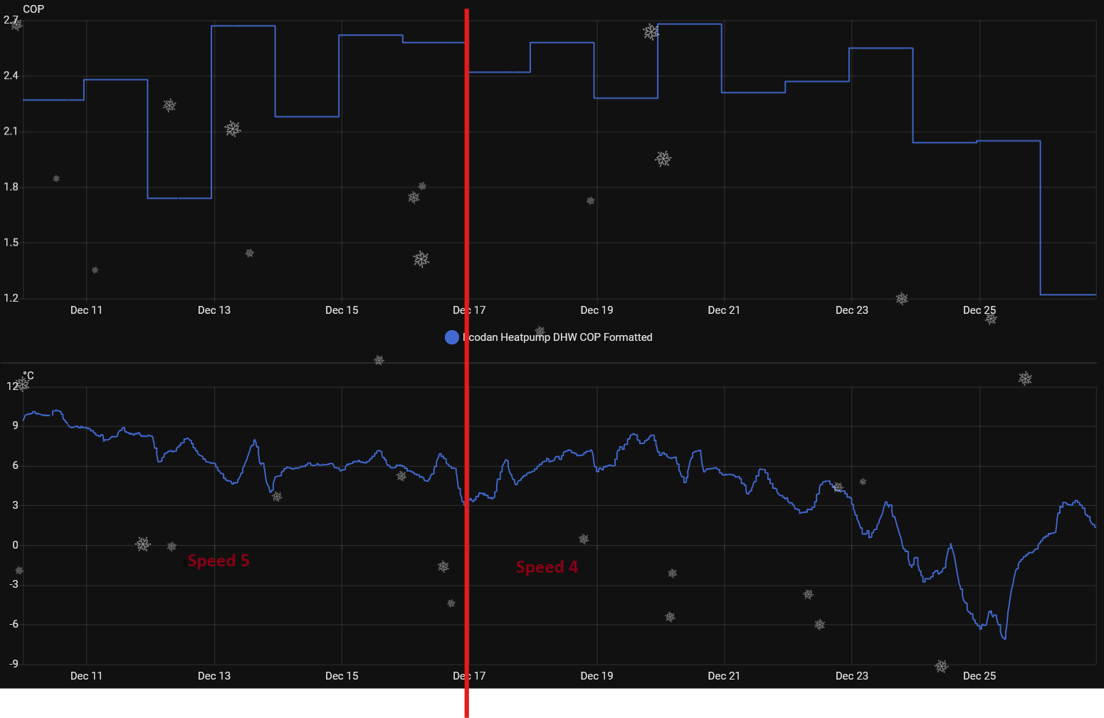 What about the pump speed for hot water production? I have tried a week with speed 5 and then a week with speed 4. Difficult to say if COP was affected since outdoor temp dropped a lot.