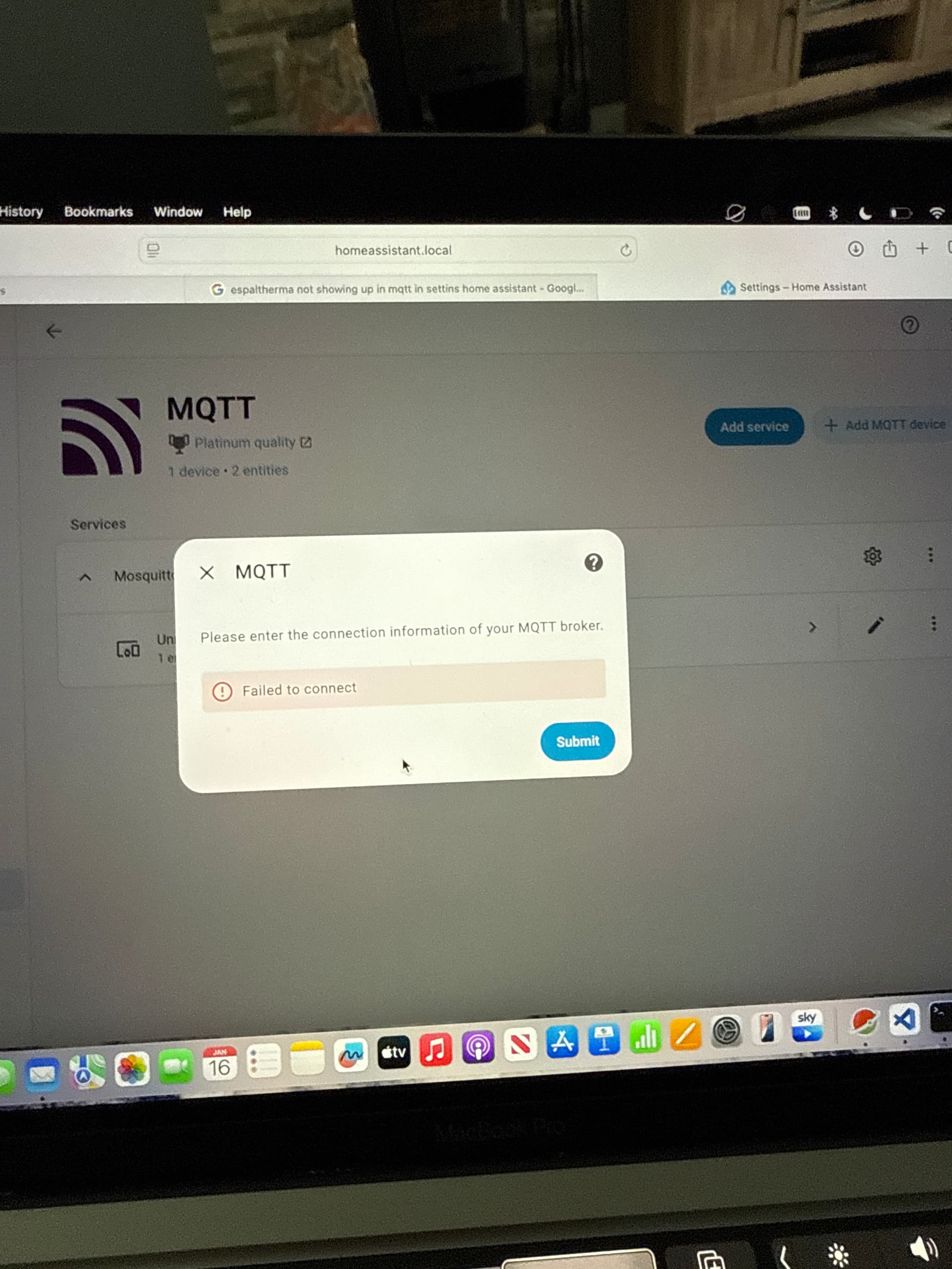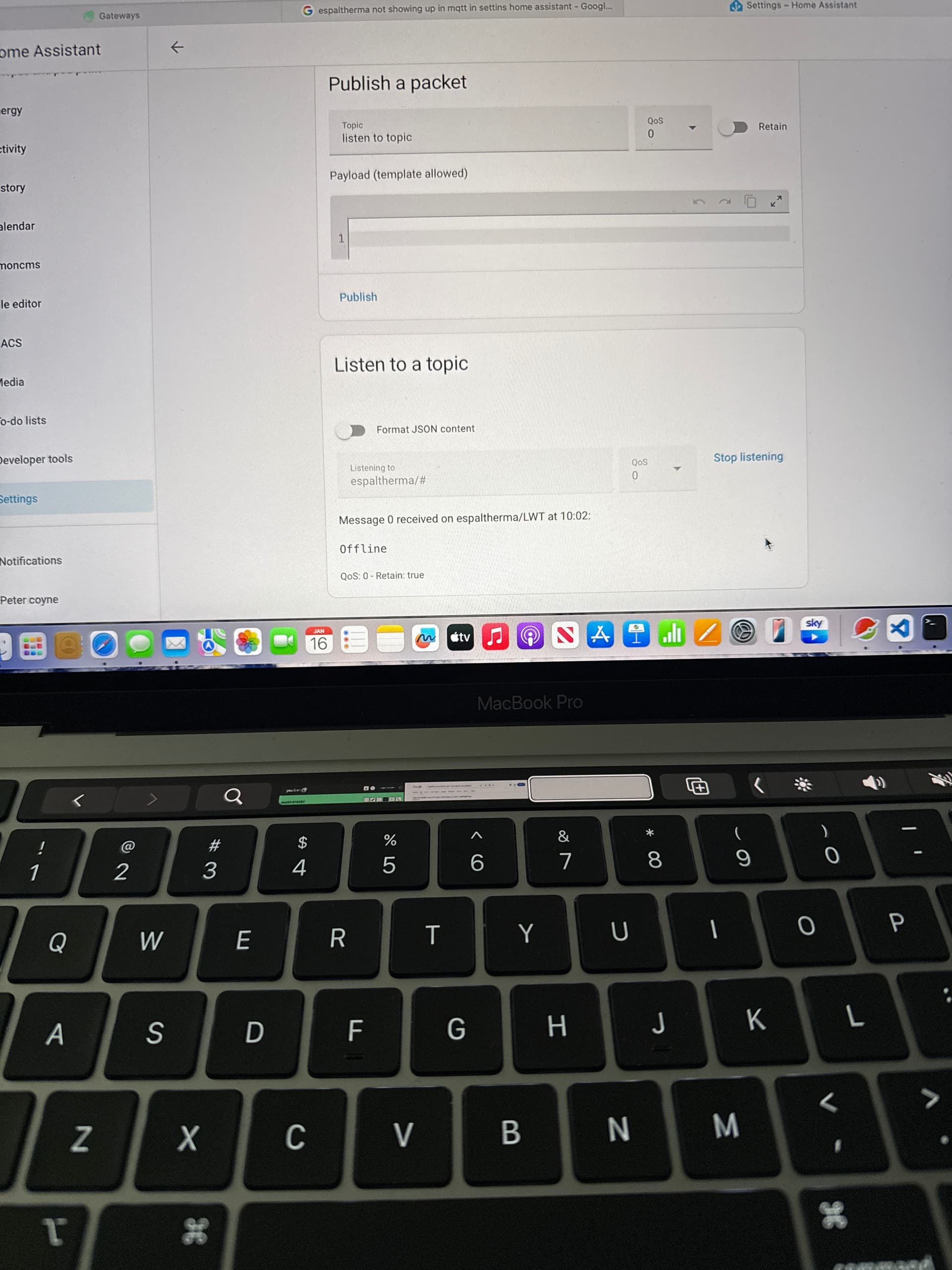 So connected back up to heat pump and issue is exactly the same, I can ping the device from terminal in Mac but espaltherma shows unavailable in Mqtt page in setting and listening shows message 0 received on espaltherma , offline