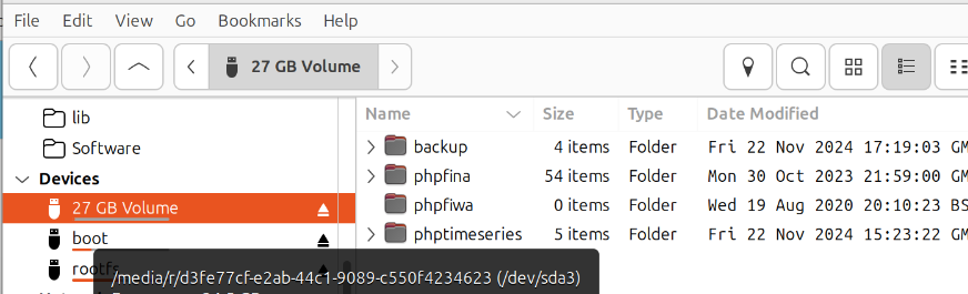 Then mount in the RPI showed the mount point of that partition (/dev/mmcblk0p3) as being /var/opt/emoncms. And that is the parent folder of the 3 data file directories.