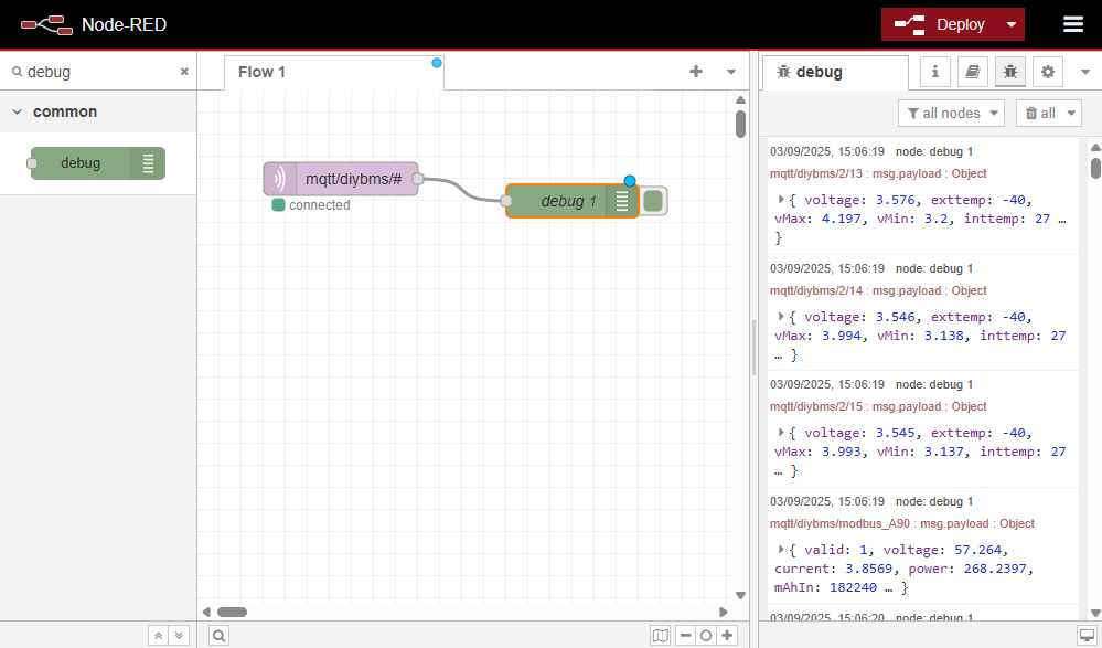 “Setup NodeRED server and make a connection to Mosquitto server. You can test that you get data by drawing a connection between the MQTT node and a debug node.”