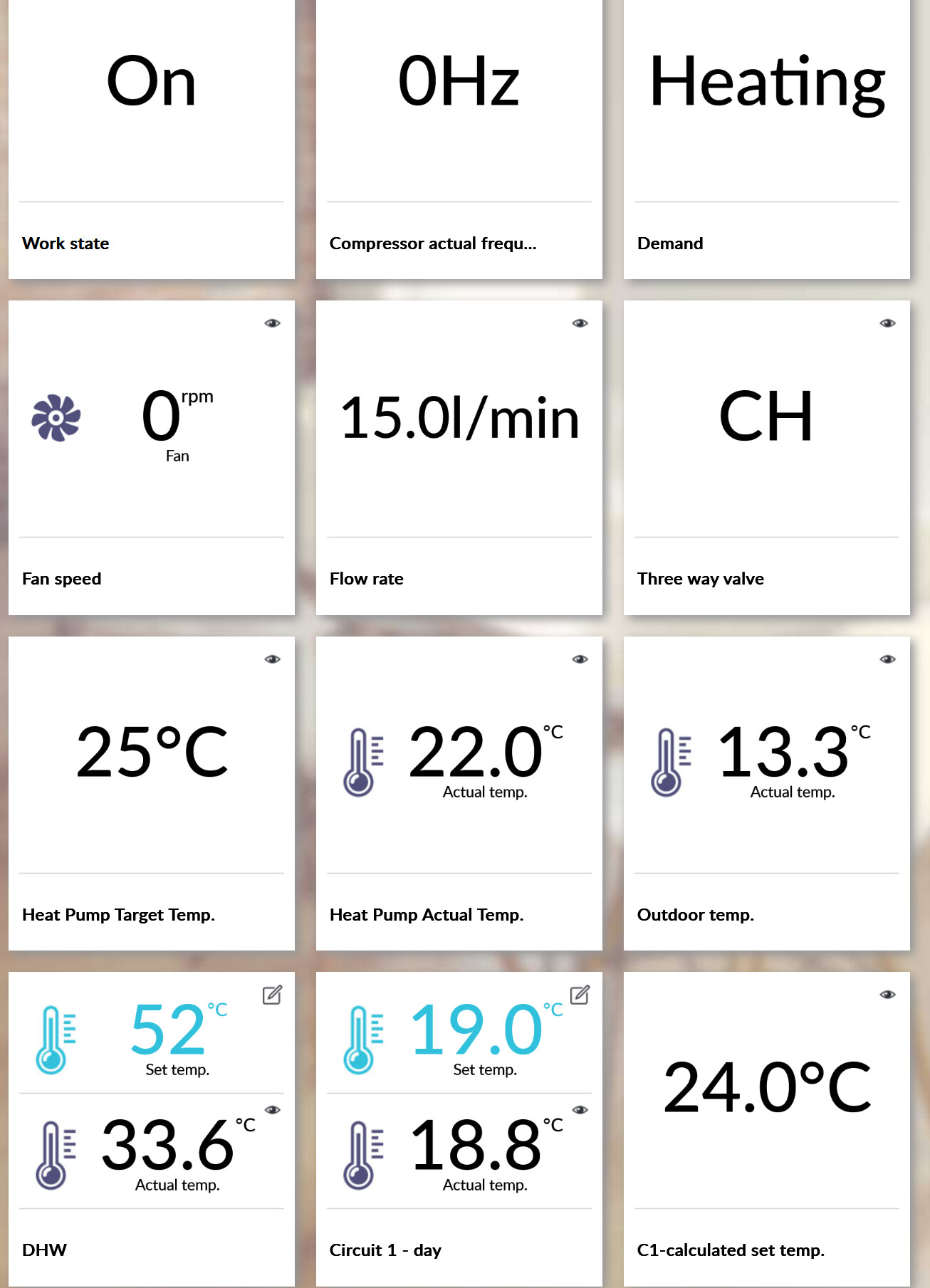 No matter what, on the smart controller touch screen the red heating demand icon is active (even if the compressor/fan are off). On the econet24 web interface it says the demand is heating, work state is on, but compressor/fans are at 0