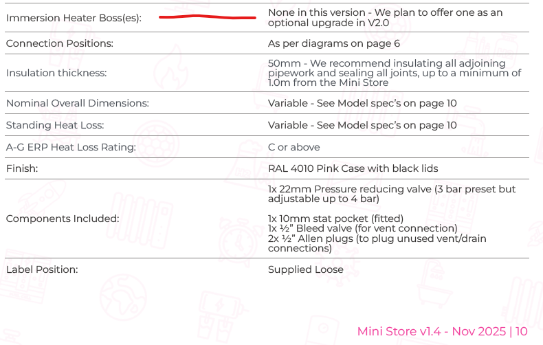 I contacted Newark Cylinders about an immersion in the Mini Store and they said that while it is being planned for v2, they can build them with an immersion connection now on request. That might be quite interesting as an option - potentially switching on the immersion to boost the store when running a bath or if itâs a particularly cold day and defrosts might be a problem.
