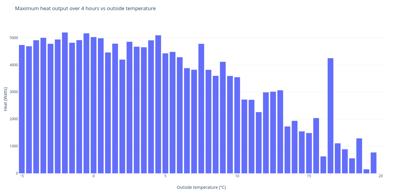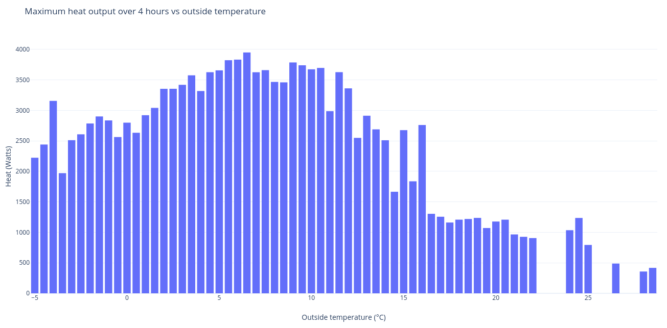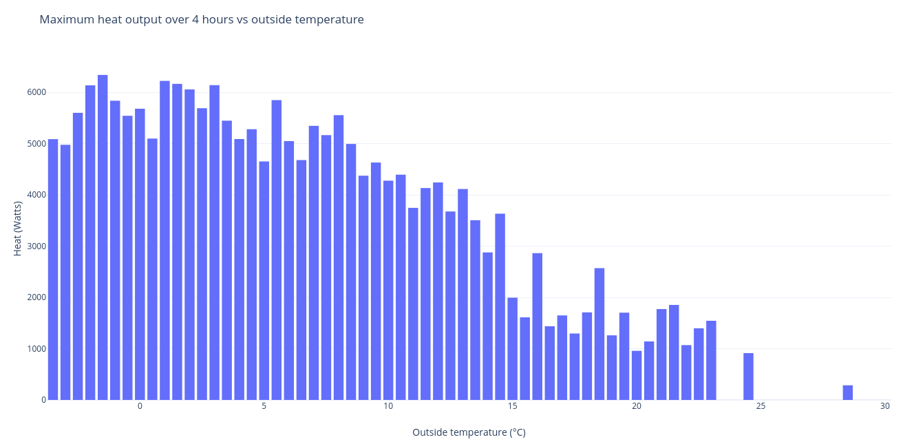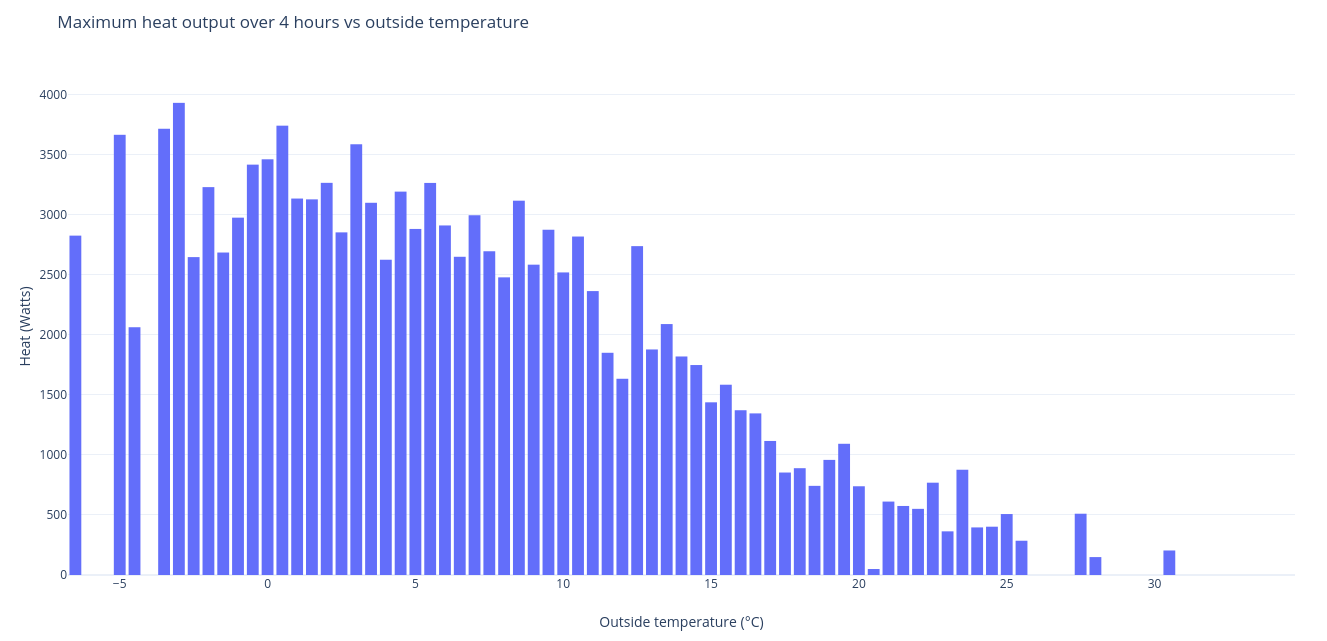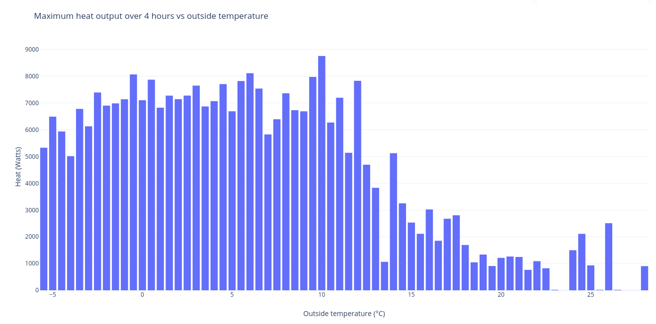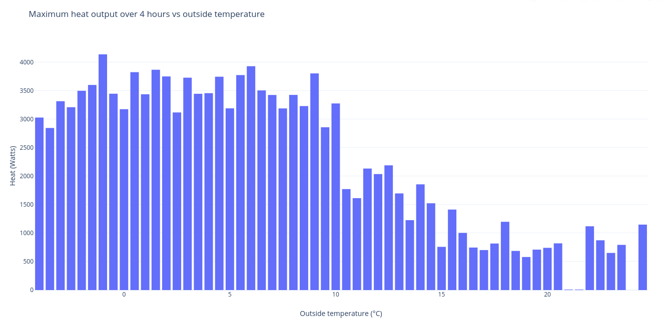 Building on the earlier table above, I thought I would try finding the maximum output of each heat pump on the list over a 4 hour period where outside temperatures were below 1C. The script that I’ve put together to generate the following can easily be modified to change the period to e.g 2 hours, or filter for specific outside temperatures, so happy to re-run this with different parameters, here are the results: