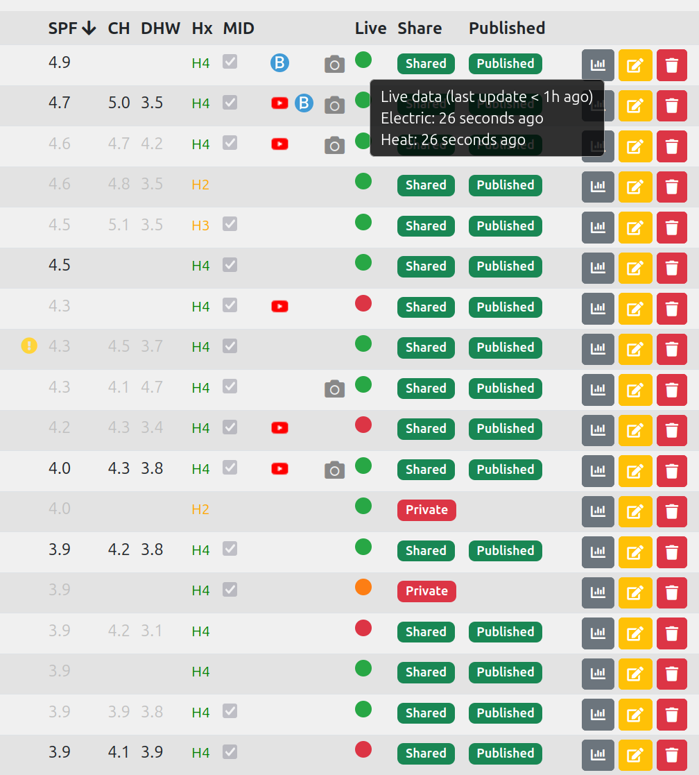 Following on from Using HeatpumpMonitor.org for private systems , another feature that we have added recently to make administering multiple systems a bit easier is to have a live data status indicator for each system. This is available for logged in users on their own My Systems list, hover over the status circle to see details: