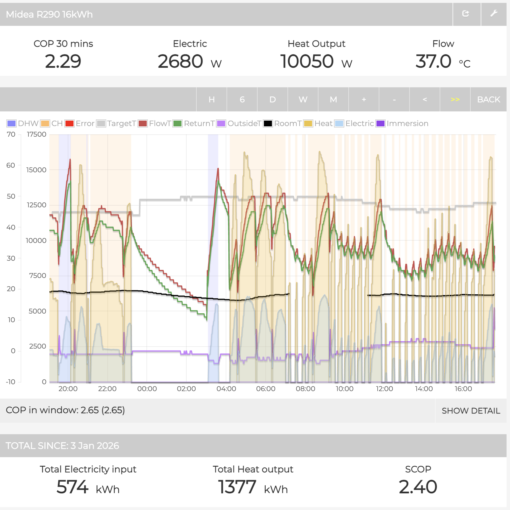 I am expecting this to yield a COP of 3668/1030=3.56. However under heading “TOTAL SINCE: 3 Jan 2026” shows “Total Electricity input” of 575 kWh, “Total Heat output” of 1377 kWh, and SCOP of 2.4 as show below.
