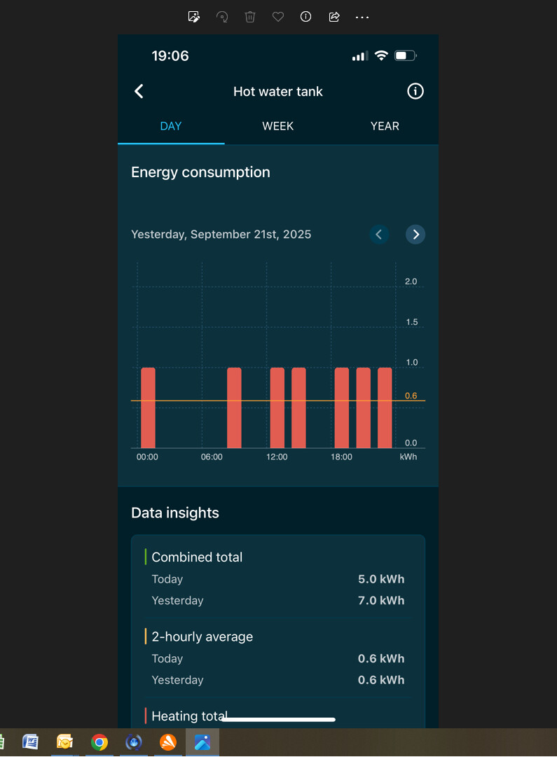 I run a Daikin EDLA08 system for both hot water and heating. I’m having a real issue with the hot water system drawing electricity several times a day outside of the scheduled ASHP cycle (same on Reheat only btw). I think the following screenshots should make the problem quite clear since it was on 22 September, so the heating system was still switched off. Here is a screenshot of the EMON monitoring of the ASHP energy consumption on that day.