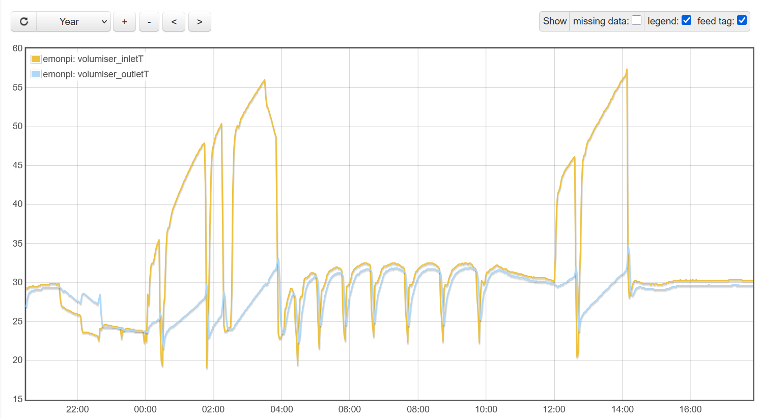 below is a screenshot from earlier in the year showing the volumiser inlet and outlet temps when the external temperature was below freezing. the high inlet temps are during hot water runs between 00:00 and 04:00 and 12:00 and 14:00. the remainder of the time the system was running on heating. i suspect the flow temperatures are high during the hot water periods because the 3-port valve heating outlet is within 450mm of the volumiser inlet so this is likely temperature creep along the pipework which is picked up by the sensor close to the valve outlet but there could also have been a little leakage through the valve. we had an issue with this when the 3-port valve was on heating with low temp heating water being forced through the hot water coil cooling down the cylinder. this has now been fixed by replacing the 3-port valve.