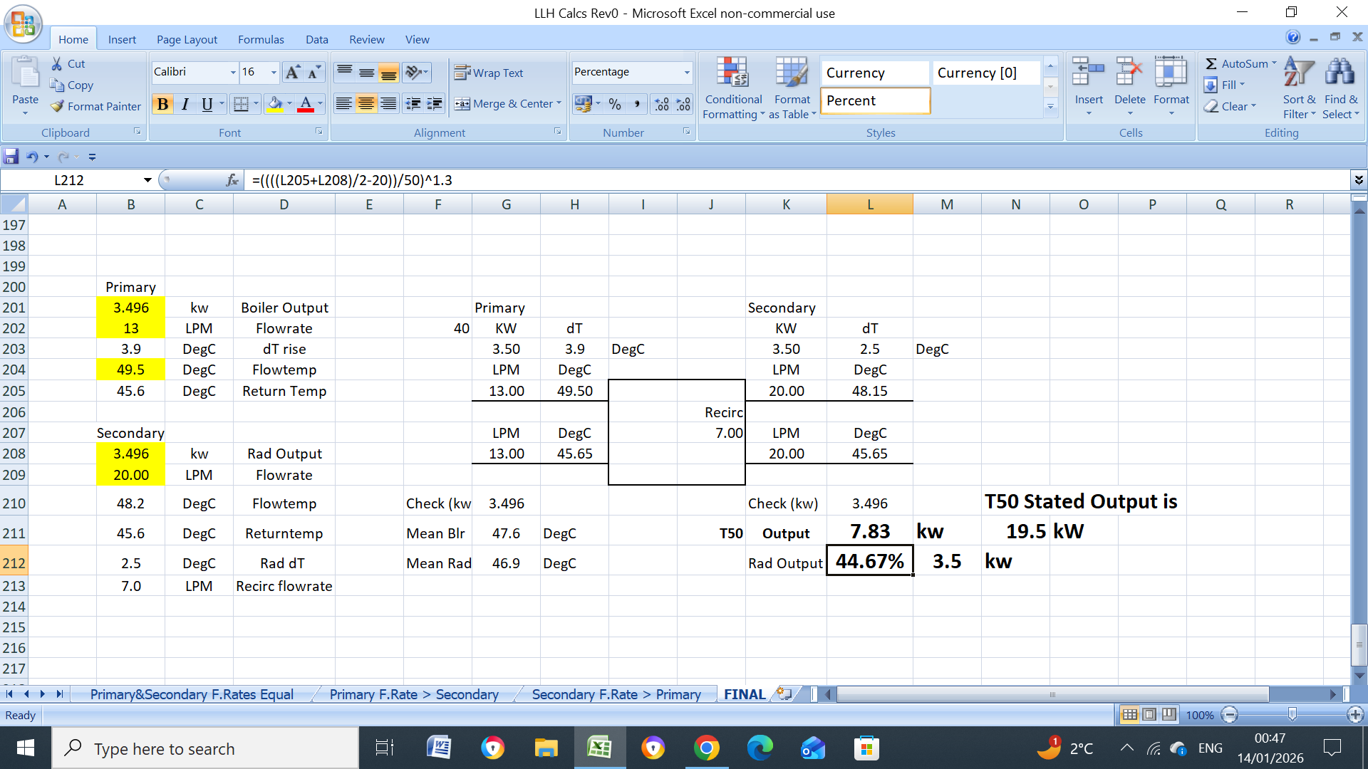 Re above , If the actual flowrate is 13.0LPM with flow/return temps of 49.5C/45.5C) dT 4C and the output is 3.4kW then the T50 rating of the rads in question just cannot be 19.5kW, I used water only but this doesn’t really distort anything, it only gives a slightly higher output of 3.6kW. The mean rad temps are (49.5+45.5)/2, 47.5C, at 20C roomtemp results in a, 47.5-20, 27.7 deg rad with a output of (27.5/50)^1.3, 46%, which means that the T50 rads “in question” can only be, 3.6/0.46, 7.83kW, or 3.4/0.46, 7.39kW (glycol). The HP specification, post #34, gives a flowrate of 40.1LPM at 14kW, which equals a dT of 5C (water) or ~ dT5.4C (glycol), the primary pump is running at full speed yet this only results in a apparent flowrate of 13.0LPM, strange?. Anyhow, enough said for now.