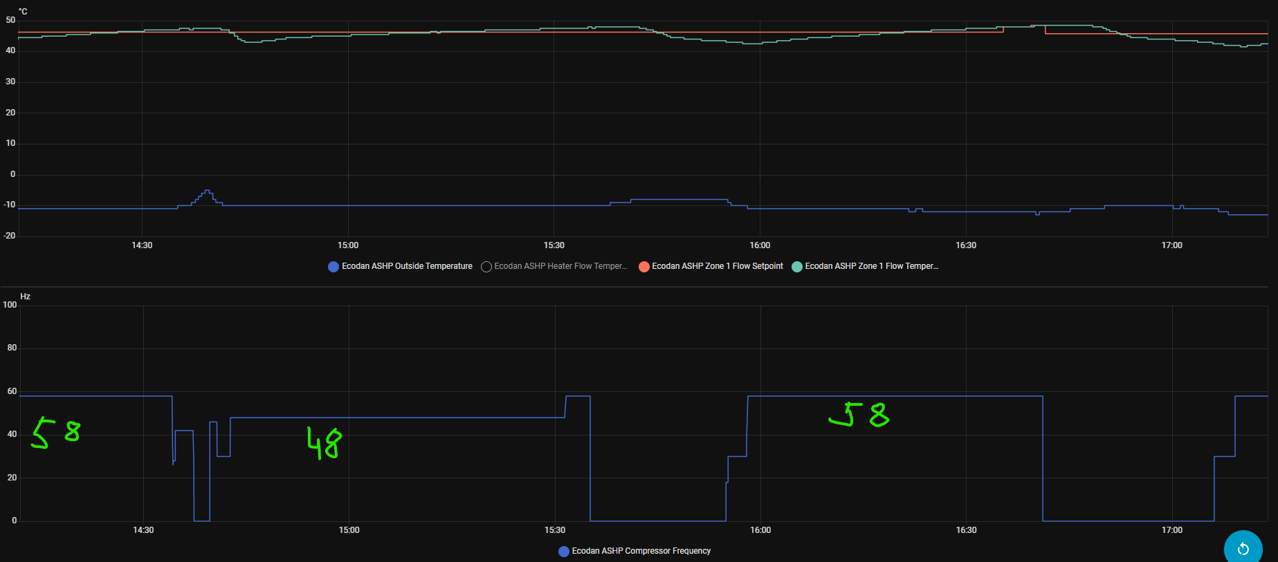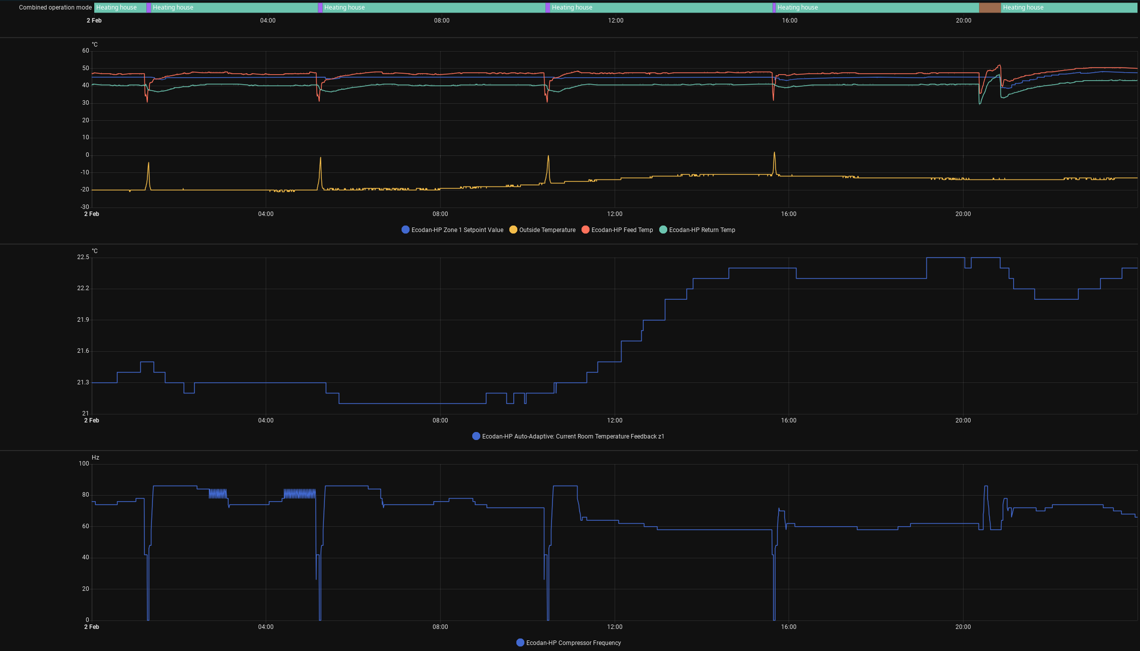 I edited the image to include the feed and return temps. You can see that the Auto adaptive system is adjusting the flow setpoint (the blue line in the first graph), according to the return temp. But like i said, none of that will fix the minimum frequency vs outside temp issue, it can only alleviate, at most.