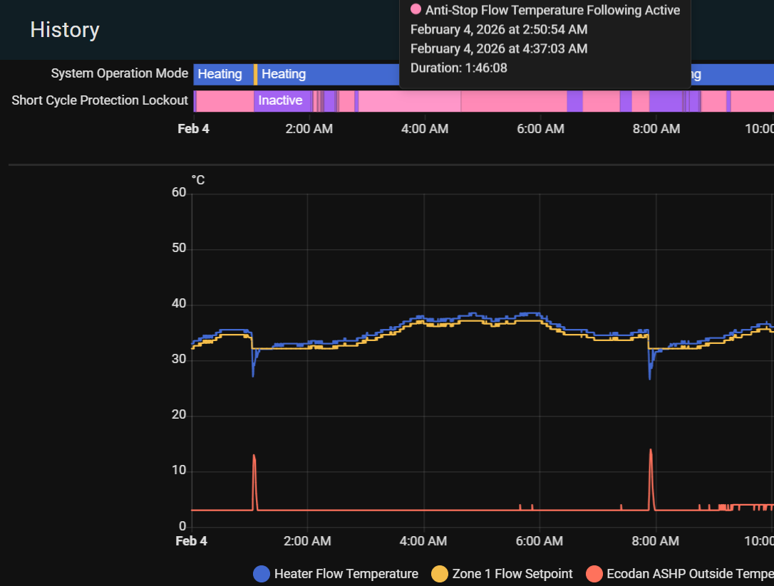 The unit is close to the limit below -20, but that’s not the reason for what you see. The max temp was limited to 45C, and you can see that it was actually modulating down to keep it in check. I have been increasing the max flow temp slowly, to see what is actually required and how it behaves.