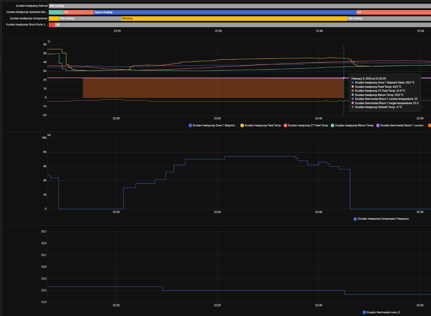 [22:38:34][D][auto_adaptive:218]: Processing Zone 1: climate source: 0, Room=22.0, Target=22.5, Actual Feedtemp: 39.5, Return temp: 33.0, Outside: -4.0, Bias: 0.0, heating: 1, cooling: 0