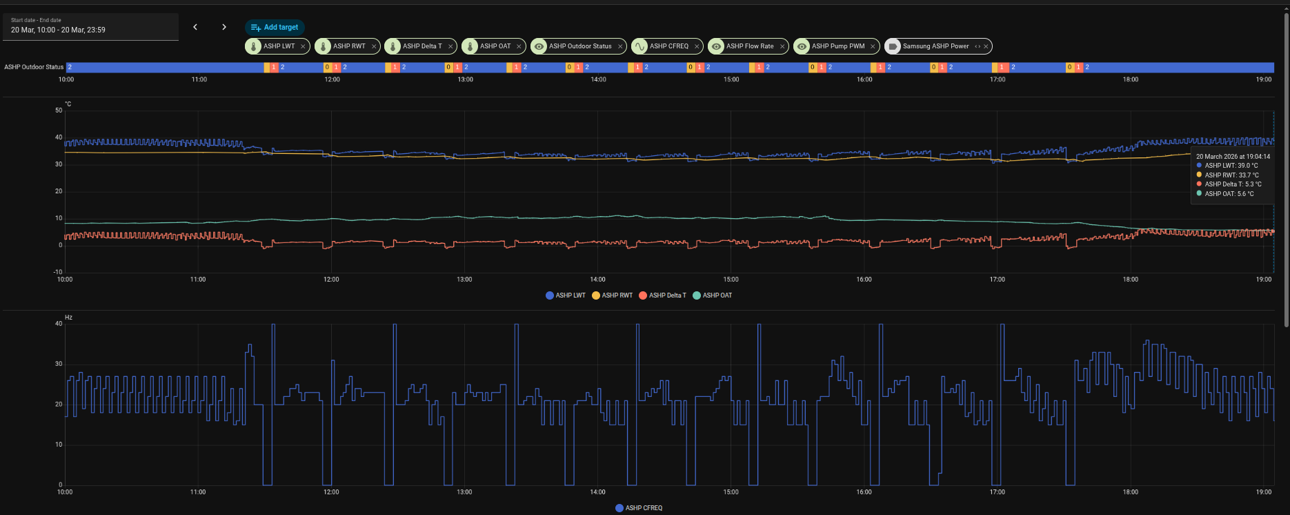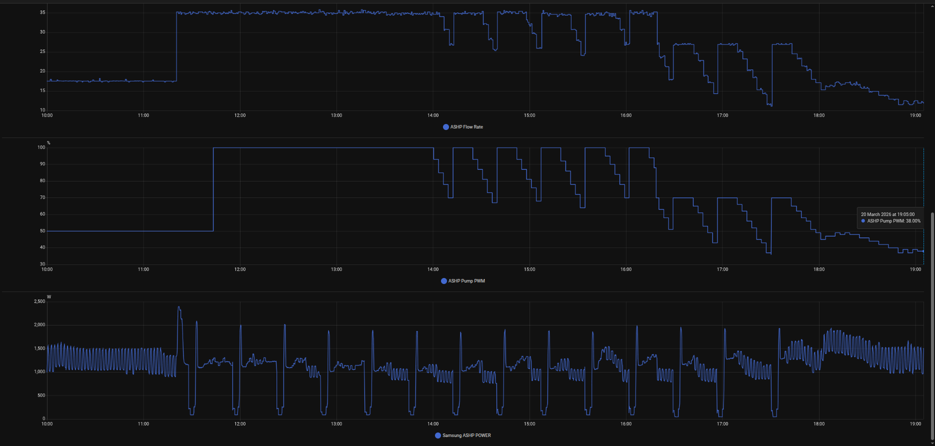 The other one looks for the cycle switch from 0 to 1 to 2, 3 mins later it modulates the pump to 40 for an hour then hands control back to Samsung. No more boom and bust cycles!