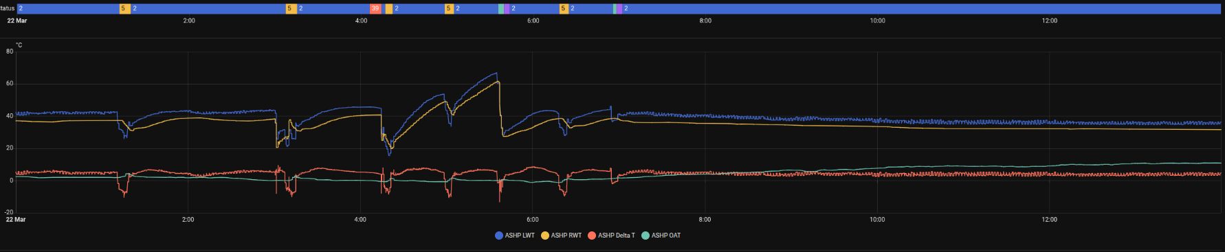 This morning I had a status 39. Everything continued to operate no impact on Comp, Pump PWM or the electrical input unit, which appeared to function normally. It then went to 5 Defrost a few minutes later and then 2 normal ~5 minutes after that. 5 defrost cycles during the night max of ~8 mins and min of ~5 mins. I assume this is totally normal. It was ~0 degrees. Maybe totally coincidentally, the status 39 appeared when the temp dipped below 0 to a min of -0.7 then back up over a ~10 minute period.