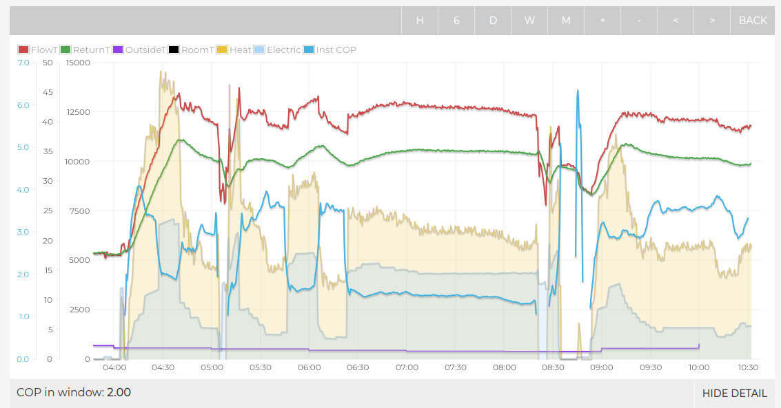 I didn’t use 83kWh of heat yesterday, 8kWh of that was hot water so it was I think 74kWh of heat into the house (including conservatory) yesterday.