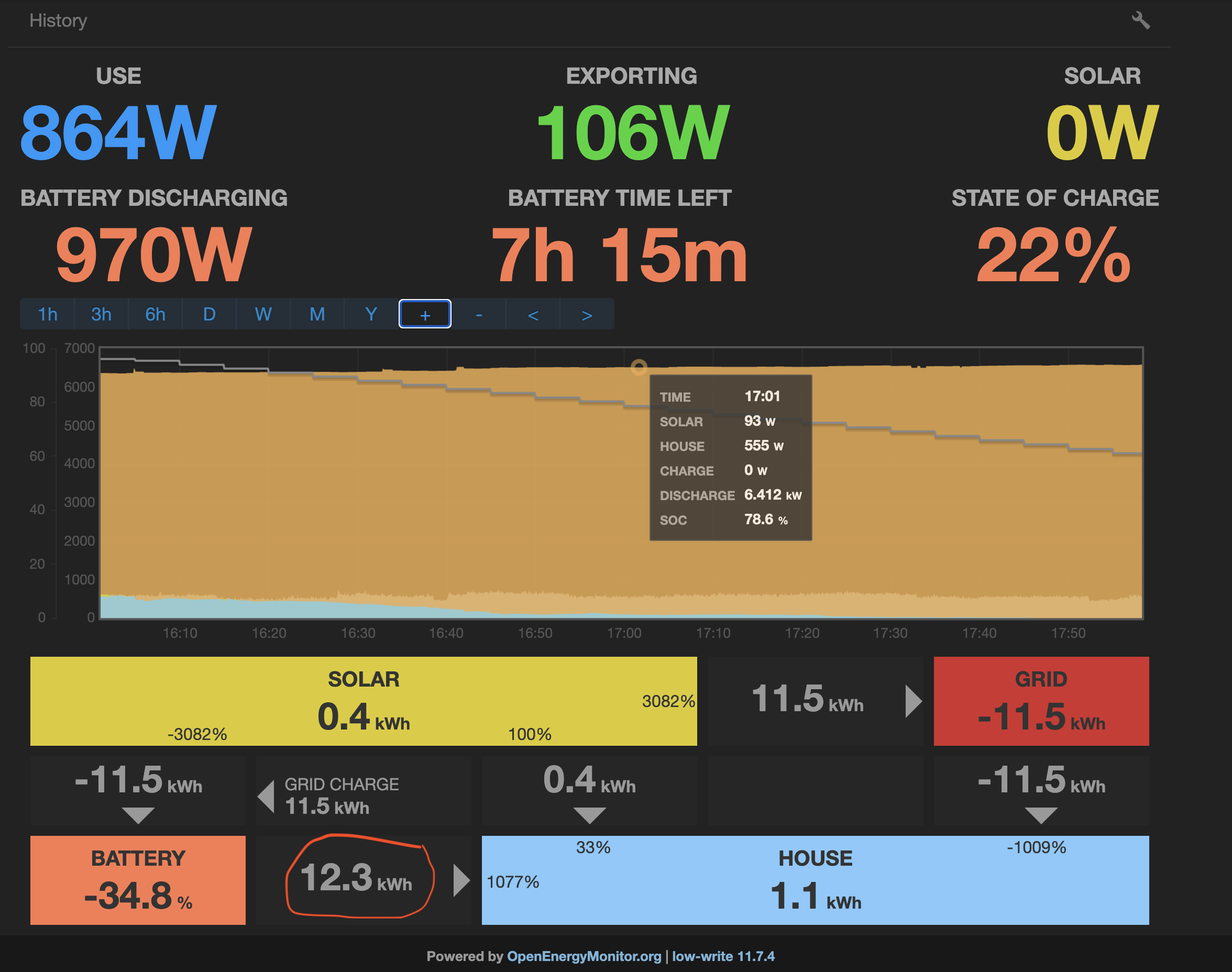 Here’s a screenshot zoomed in on the Octopus Flux Export peak period. The battery is force discharging at 6.4kw. I don’t understand the box I’ve circled in red, 12.3kwh going where?