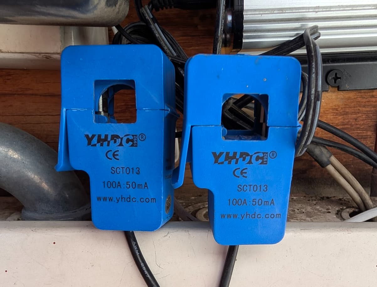 One CT (phase 1) is pointing towards the load and the second CT is pointing the other way. The voltage sensor (ACAC converter) is connected in phase 1.