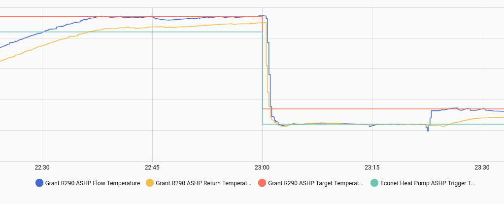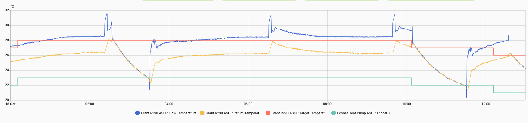 I do wonder if it has some sort of kindof backoff / anti-cycling delay, because here the flow and return dropped below the trigger line and it didn’t kick back on (ignore the “trigger” during DHW - it’s just a dumb target - 5 sensor):