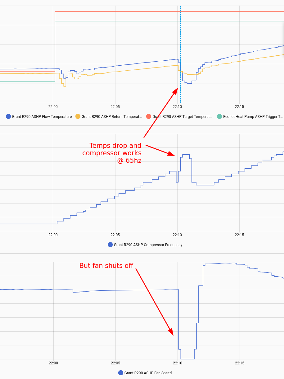 After the start of the run, or do you mean if there is a CH demand after the DHW run it doesn’t immediately start back up? The little gap Glyn showed above I do find very odd. The fan also stops whilst the compressor is running. Sounds like a bug to me, I asked Grant and they seemed to think it shouldn’t do that.