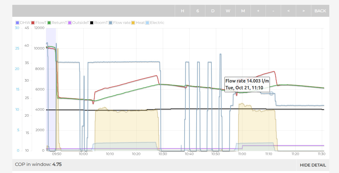 I can see your pump is now modulating down to 14 L/min. This is great, the lowest I’ve seen from other Grant HP290s is 18 L/min which is not too bad for 9kW+ units, but your 4kW unit will definitely benefit from lower flow rate.
