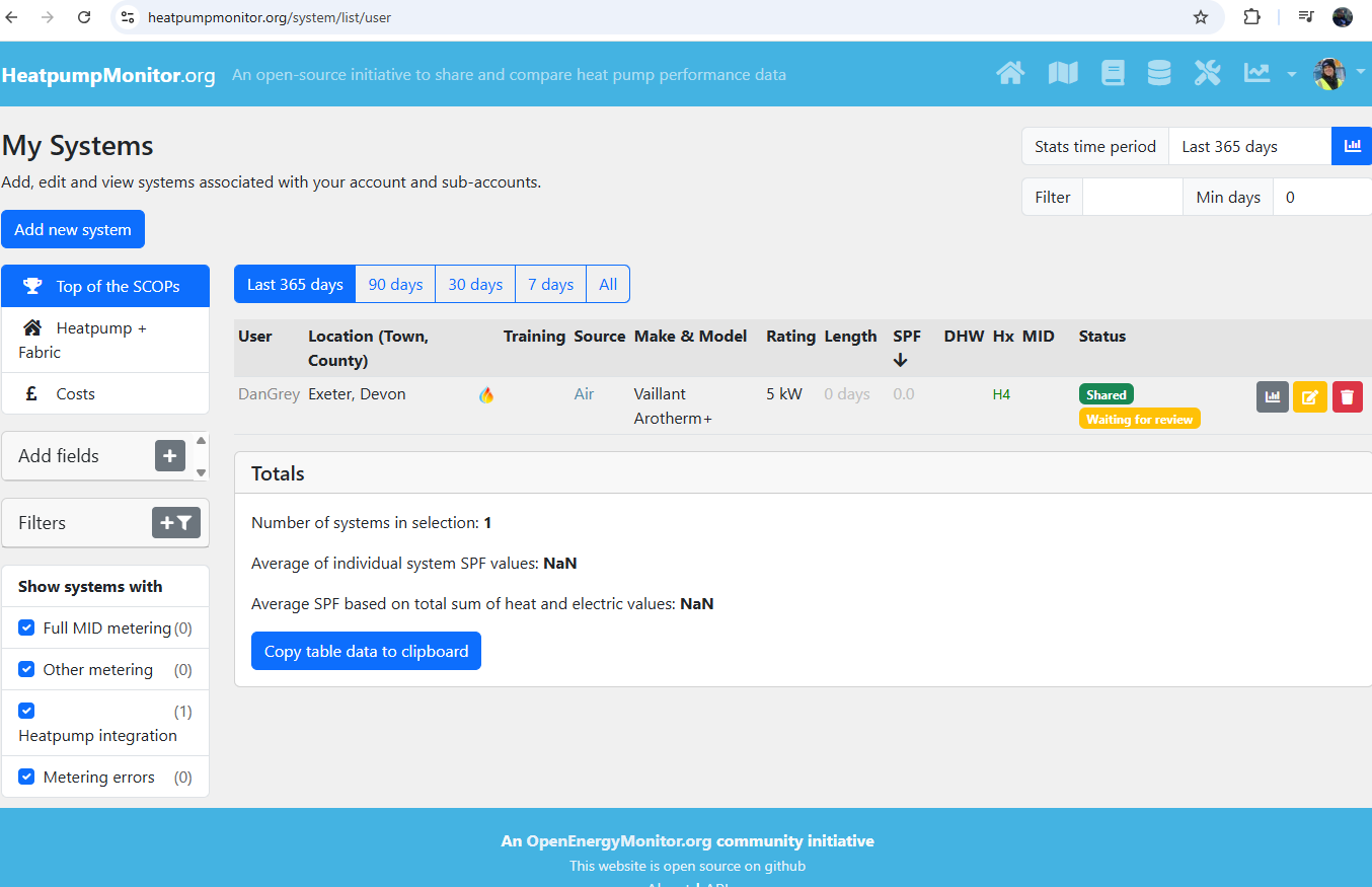 Next, I go the heatpumpmonitor.org. I log in with my emoncms.org username and password, click my profile pic, then My systems. I click the ‘Add new system’ button and under the ‘Select Emoncms.org dashboard’ header I choose ‘[my username]:[the name of the app I just made]’. I go down the page filling in all the details I can, including the read-only API key from emoncms. If the page won’t let me save I better just add some best guesses into the fields it’s not letting me leave blank. Then, when I press save, I should have a heat pump system system listed as a row on the screen, with the label ‘awaiting review’. If I click the graph icon I can see the emoncms chart and stats on heatpumpmonitor.org but no-one else can until the nice Mr. Hudson approves my system