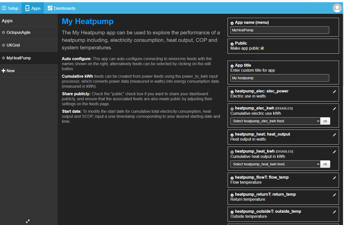 I now need to add an ‘app’, the MyHeatpump app. I go to Apps, +New, select MyHeatpump. On the right I need to select the dropdown in each little box and choose the appropriate feed for the title of the box e.g. for ‘heatpump_elec’ and choose ‘elec_power’. After filling in as many as I can, a ‘launch app’ button should have appeared beneath the column of boxes. Click that, and I should – after a minute or two – see a lovely emoncms chart of the parameters my heat pump is reporting.