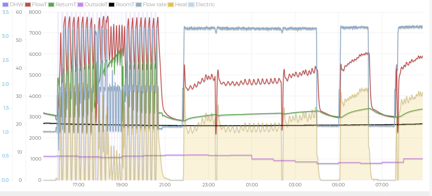 Your second graph is puzzling - apart from the confusion over the DHW mode - since the Return temp (Green) doesn’t appear to mirror the Flow temp (Red). Please could you clarify where those Flow and Return values are sourced from: is there a Heat Meter connected to the emonPi, and do the readings come from that?