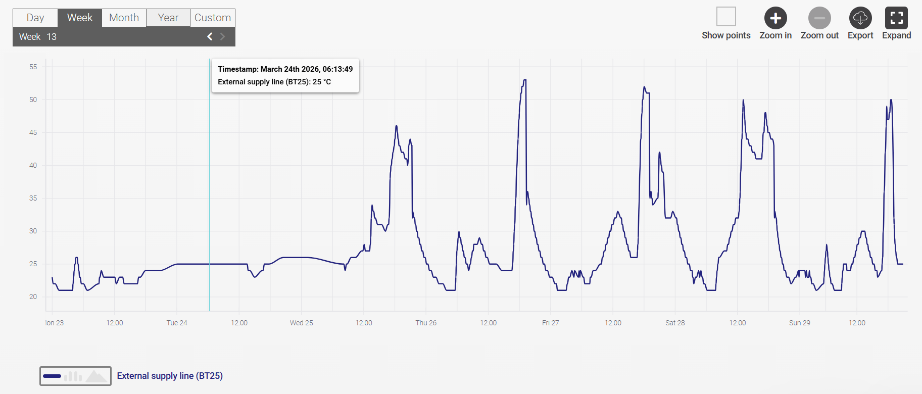 Thanks for the extra info and the graphs from myUplink. Having the Hot Water set to ‘Lux’ mode without a correspondingly high usage of DHW could certainly explain the frequent-but-brief high temperature runs (and the lack of alignment with the heating(?) return temperature).