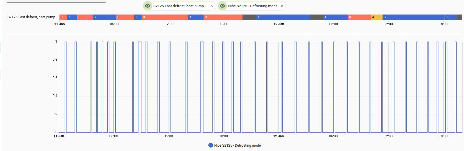 Another observation, I have made the past couple of days, is that the defrosting fails around 50 % of the time. This is illustrated below where the ‘last defrost’ indicates whether a defrost was successfully completed (value of 0) or failed (value greater than 0). 3 means that a defrost failed due to low flow while 4 means that a defrost was ‘aborted due to low LP’ (not sure what LP refers to). Black is unavailable. The defrosting mode (blue curve) indicates the defrost cycles. Despite this high failure rate, I do not observe any ice build up on the outdoor unit.