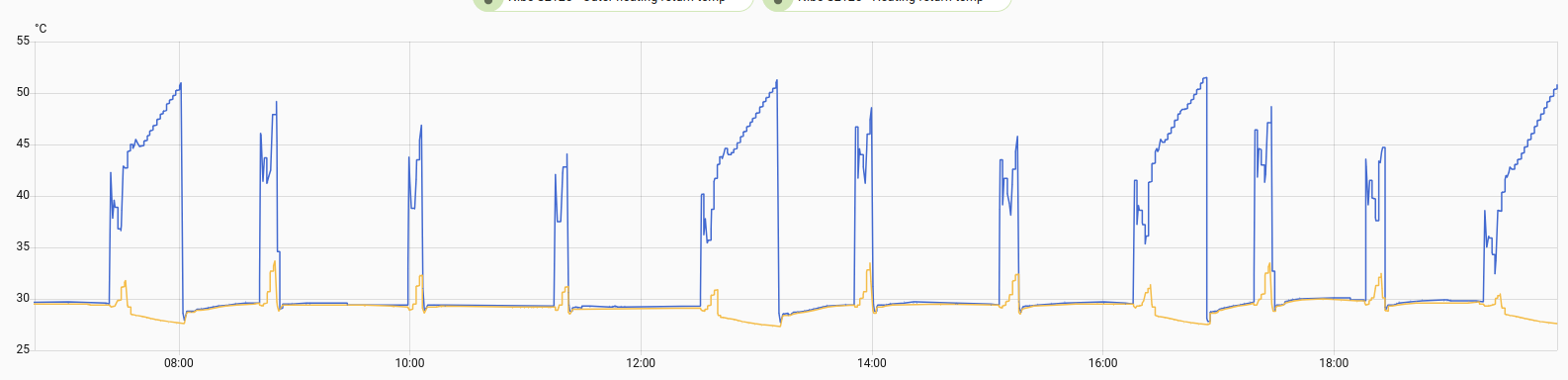 Thanks a lot for the inputs. Yes, I have the NIBE VVM S320 indoor unit. The return temperature (BT3) is the same as the return temperature of what you can see in the logged return temperature on EmonCMS ( HeatpumpMonitor.org ) when the system is heating up the house. When producing the DHW, it changes a bit, but not by much. I have logged both (for today) on my Home Assistant, and you can see them both in the plot below (blue is return from the heat pump (what is logged by EmonCMS) and yellow is BT3).