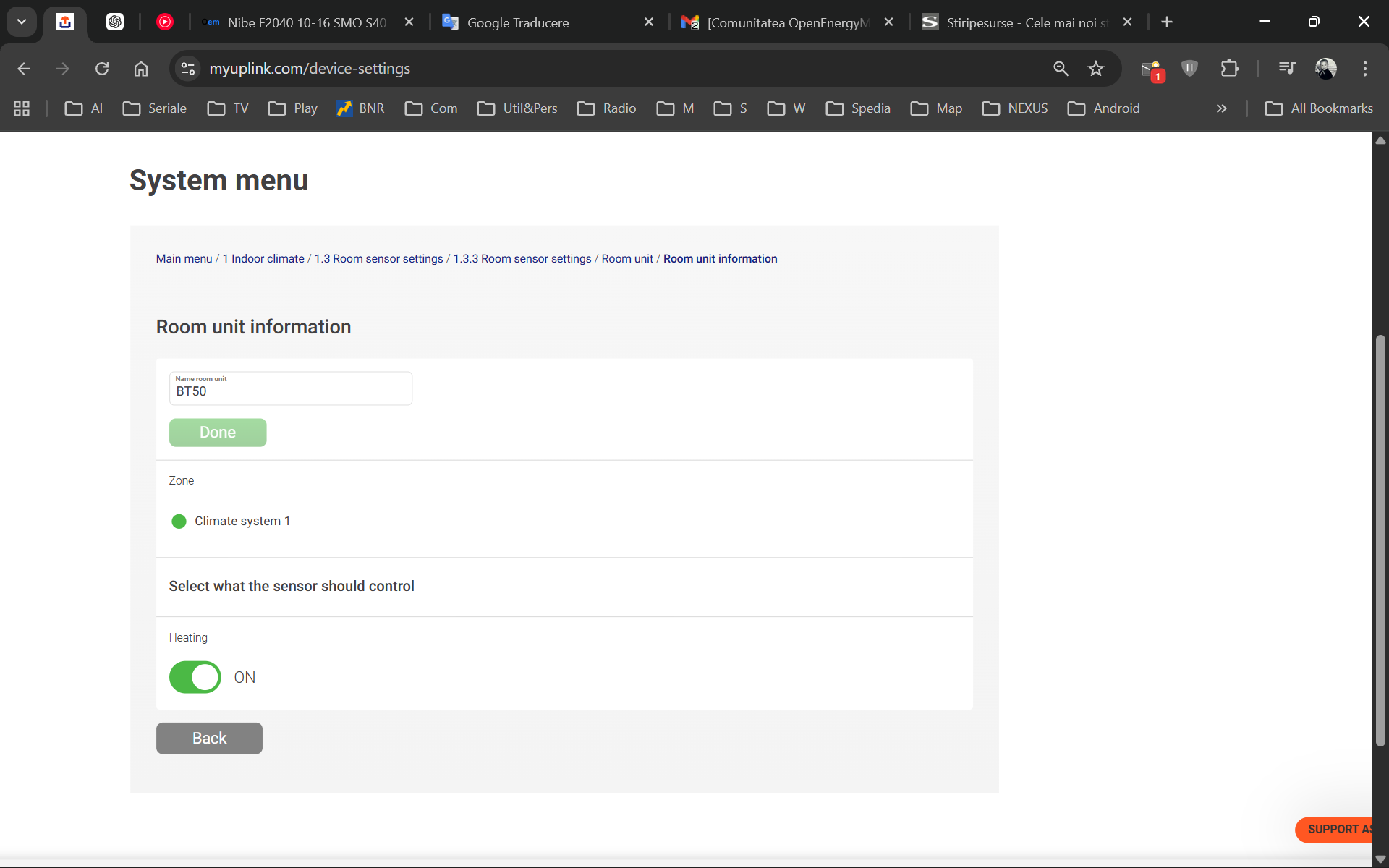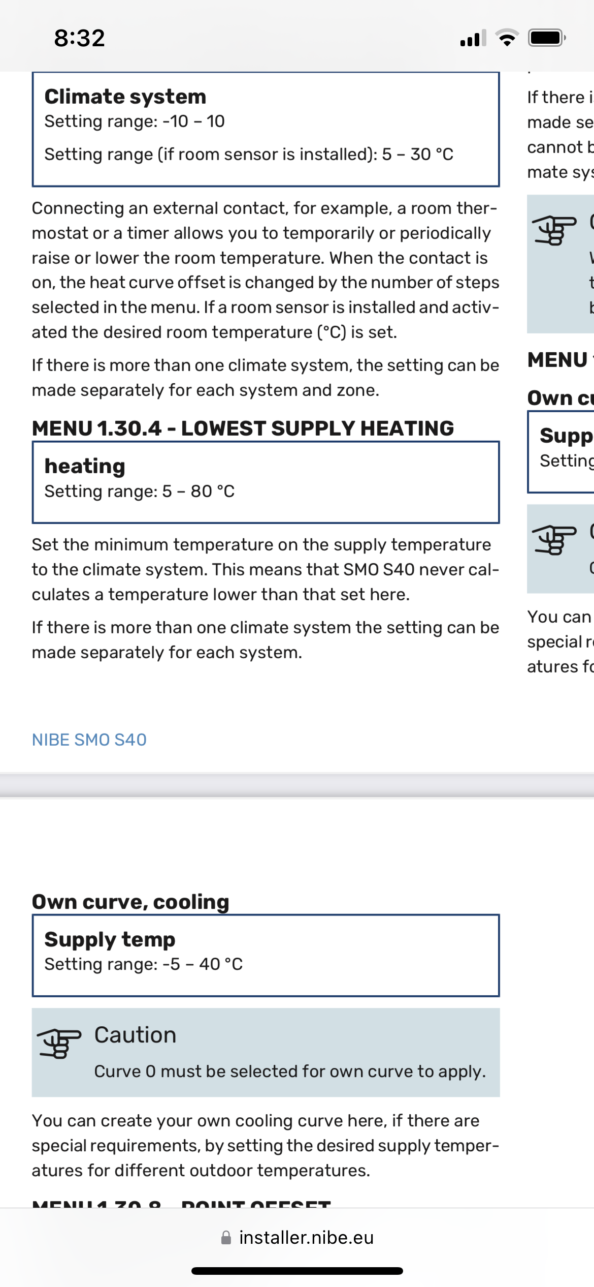 Thanks Vali. That’s the setting I was referring to, so BT50 at 24.2C (with an Indoor Temperature Set Point of 21.5C) should be tending to reduce the S1 Calculated Target flow temperature - to some extent. With the SMO S40 I don’t believe there’s any way to control how much S1 gets influenced by BT50 (with the older NIBE controllers there’s a “factor” setting you can adjust).