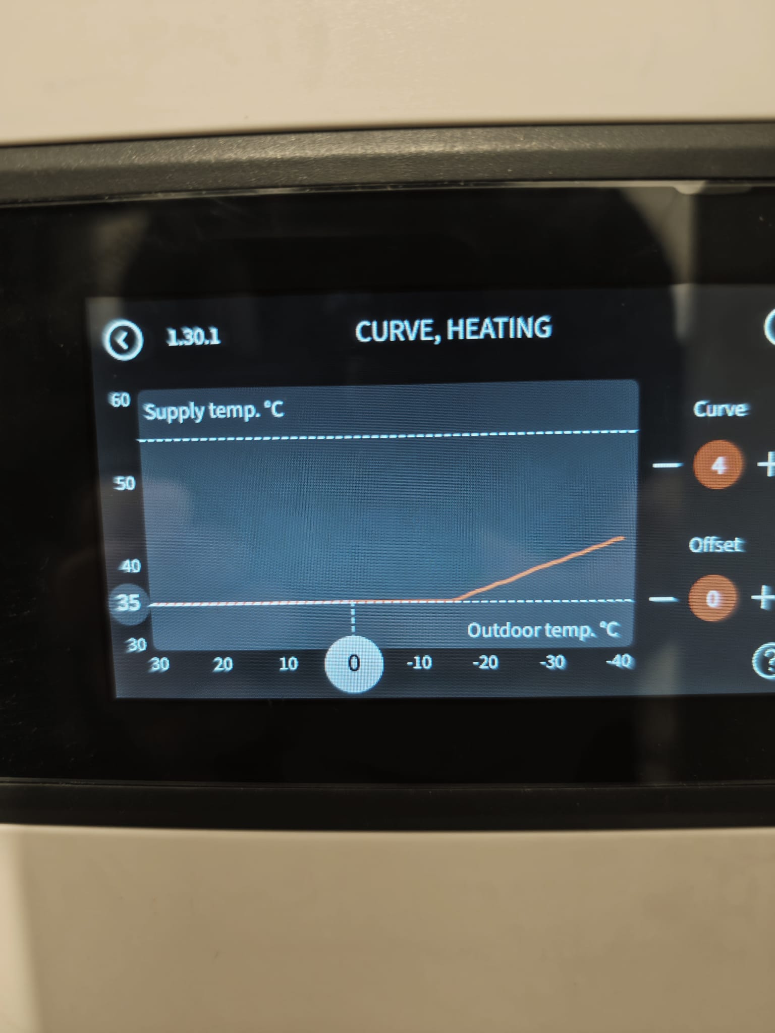 Hi David, I can say that the technician from the Nibe representative had access to the system and made various settings and monitored various climate curves. Now the system works on climate curve 4 with offset 0 (I know, it seems small for heating with radiators). I tested a period and a curve of my own. The problem is that no setting changed the behavior of the pump. To use a figure of speech, it is like a car that drives at approx. the same speed no matter how much you accelerate it, brake it, no matter how many curves, slopes, ice on the road… It runs on a locked autopilot). In fact, it is as if the climate curve does not work.