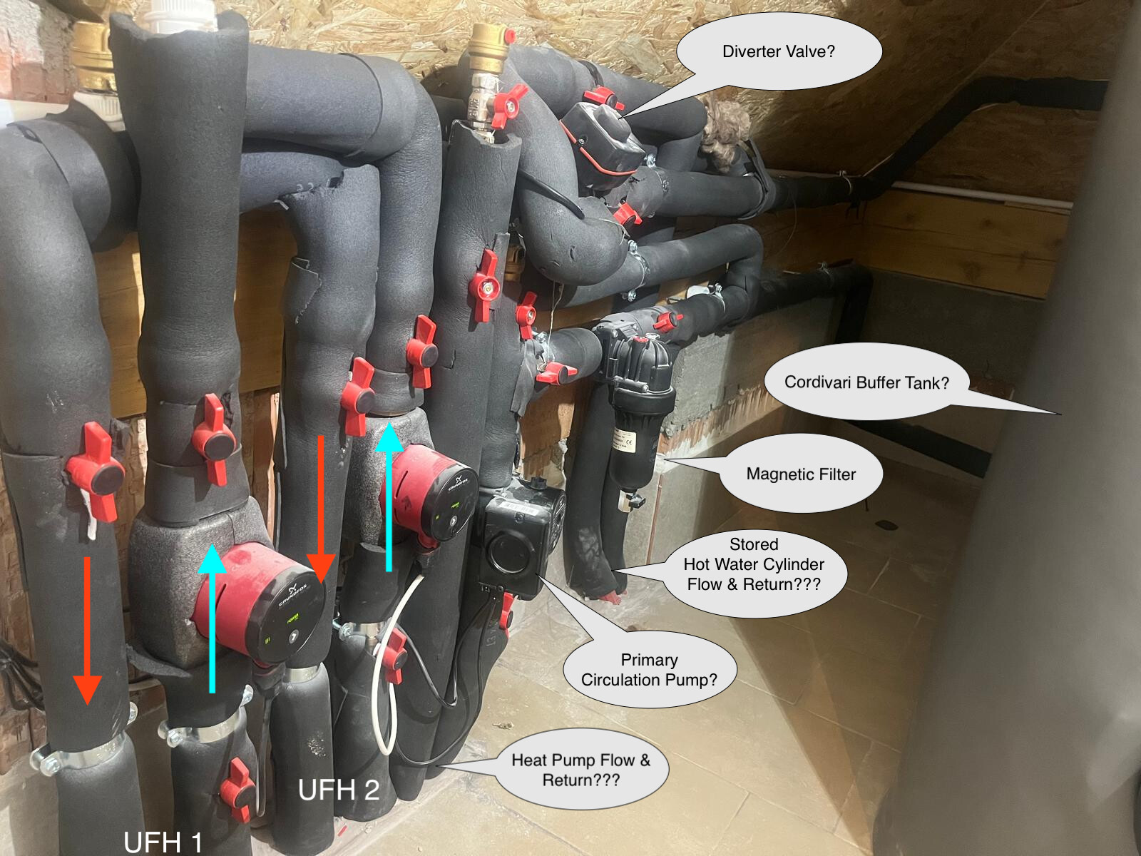The UFH connections are clear enough and I believe the two red Grundfos pumps will be pumping ‘upwards’. (I have the exact same pumps and their flow is ‘away from’ the electrical connection; you also have an ‘up’ arrow marked on one of your pumps.)