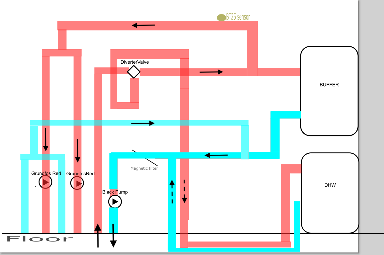 If these two pumps are pumping ‘upwards’ then they’re effectively on the Return from the UFH, not the Flow to the UFH - which would mean BT25 is seeing the water after it has been through the UFH - which could certainly explain your low BT25 reading.