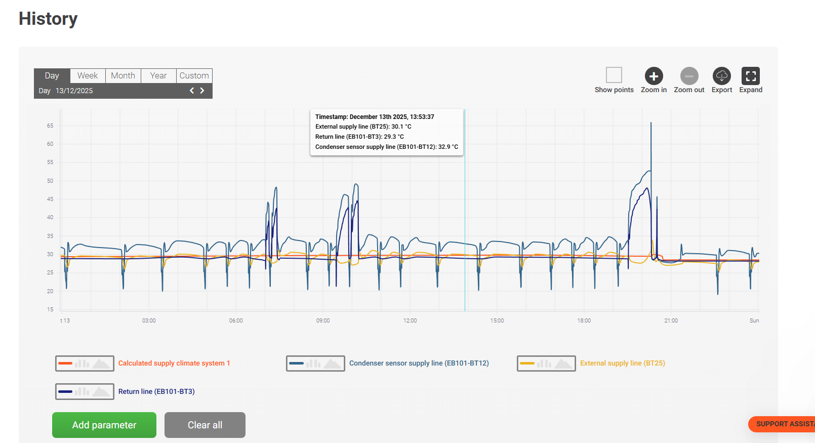 My main concern is that there’s always a quite significant difference between the BT12 (flow line sensor from the heat pump) temperature and the BT25 (flow line sensor to UFH). Sharing some graphs here.